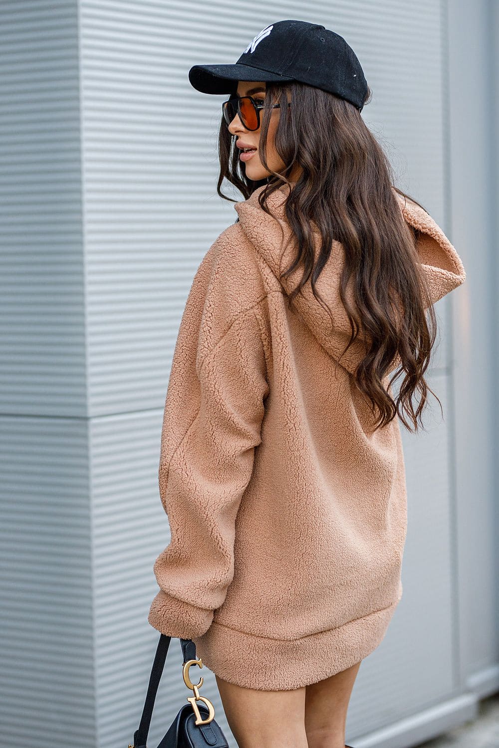 Oversized, sweatshirt made of soft, warm teddy is an ideal choice for women who appreciate comfort and freedom on cold days. Sweatshirt with a spacious hood, long sleeves, patch on the front.