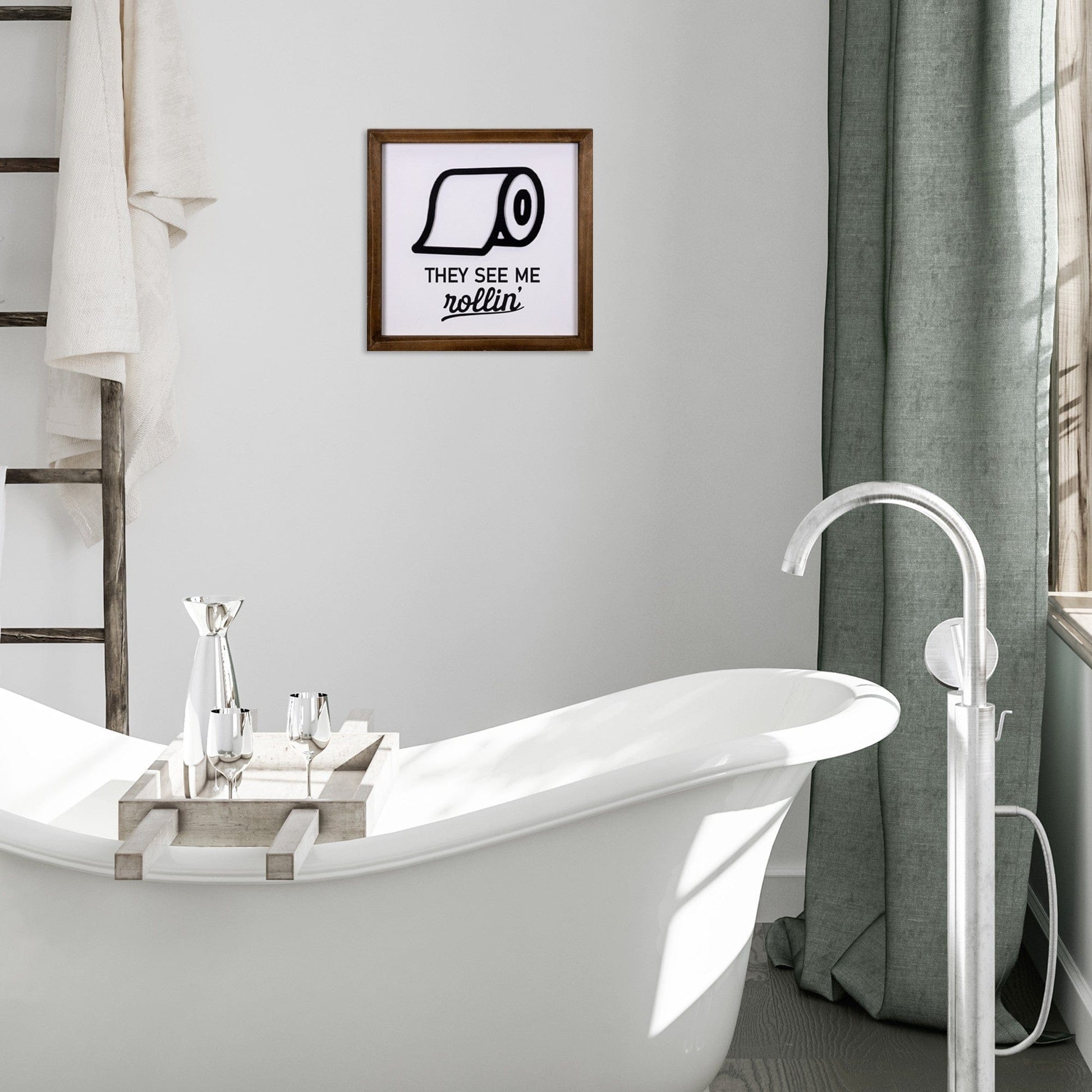 Add a touch of whimsical design to the walls of any bathroom of your home with this They See Me Rollin' Framed Wall Art. The frame of this piece is made from wood and is colored to a dark brown varnish that allows the wood grain to show through. Inside there is a plain white background which is perfect for the simple black line drawing and font on top. The drawing is of a toilet roll slightly unraveled with the words 'They See Me Rollin'' written below it in two different fonts for added dimension. This fun wall art will be a great one for your guest bathroom or powder room or you can use it in your own bathroom for added design and whimsy. 12" H x 12" W x 0.88" D