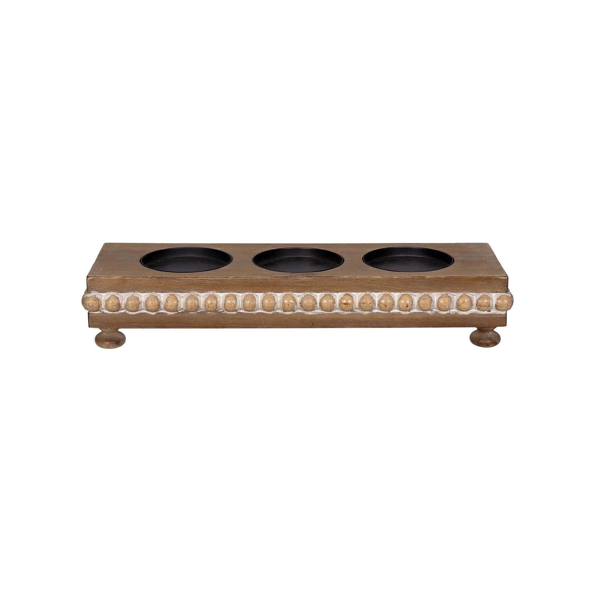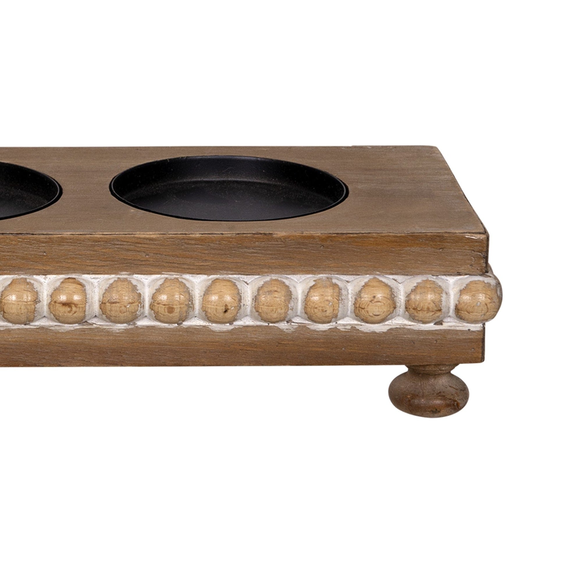 Add a stunning centerpiece to your living room table with this Three Slot Wooden Candle Holder. The whole piece is made of wood and has a narrow rectangular shape that stands on four door knob shaped feet. The finish on the piece is done in a light brown color with slight wooden details showing through. The top has three circular slots that are black on the inside. Around the middle of this candle holder there are light brown wooden details sat on a white background. This subtle detailing adds a touch of dimension to the overall look. Use this candle holder as a centerpiece on your coffee table, your dining table or in your bookshelf as a stand-alone decor piece. 2,75" H x 14" W x 4.25" D