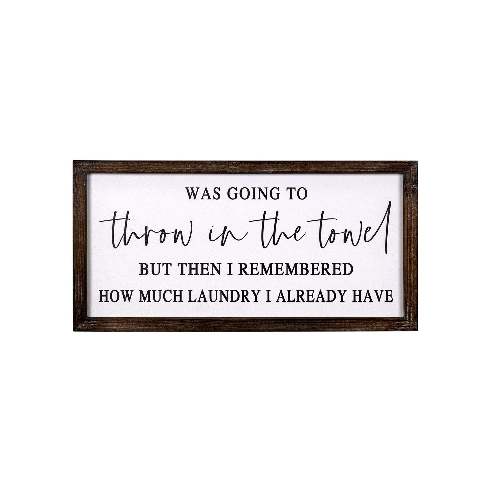 A whimsical way to add some design to any space in your home, this Throw In The Towel Framed Wall Art has a very minimalist feel to it. The frame of this piece is made from wood and is finished to a dark brown color. Inside there is a white background with the words 'Was Going To Throw In The Towel But Then I Remembered How Much Laundry I Already Have' written on it in black with two different fonts. This wall art can be used in your laundry room or you can use it around your home to bring in an element of fun. The neutral colors of this piece allow you to use it anywhere without worrying about any clashing colors or styles. 10" H x 20" W x 0.88" D