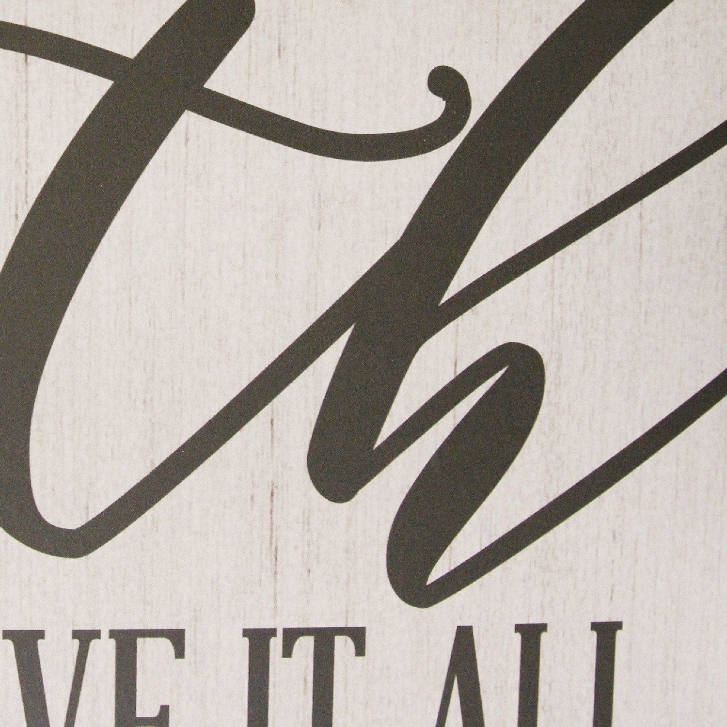 Put your feelings on display with the "Together We Have It All" Oversized Wall Art. This frameless wall art is handcrafted in a simplistic design letting the words Together We Have It All be the main focal point. The five words in bold type emphasize the meaningful message. Printed on faded grain white paper on board with a large footprint measuring 31.50" W x 1.18" D x 11.81" H, youll want to find a perfect spot to make a statement. Easy to hang with the attached V-hook on the back.