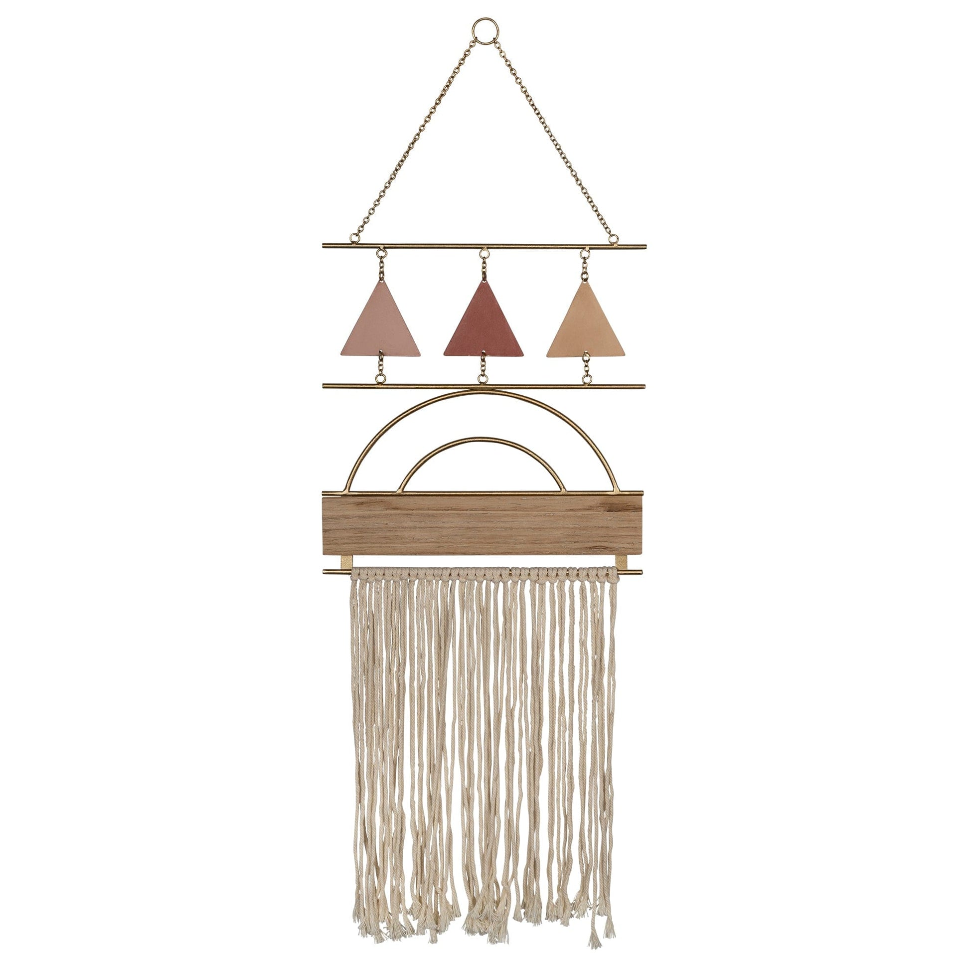 Boho-themed macrame pieces instantly add a certain coolness to your space. There's something magical about decor oozing with bohemian vibes that make them great pieces to have in any home.The Triple Triangle Macrame Wall Decor will add textural and visual appeal to your home. With its matte gold frame, natural wooden details, and soothing hues of pink, peach, and cream, this hanging decor will grab anyone's attention. It has a modern look to it that's balanced out by the graceful flow of the ropes hanging down. Made of 60% metal and 40% linen, this piece measures 11.81" W x 0.2" D x 33.86" H inches.