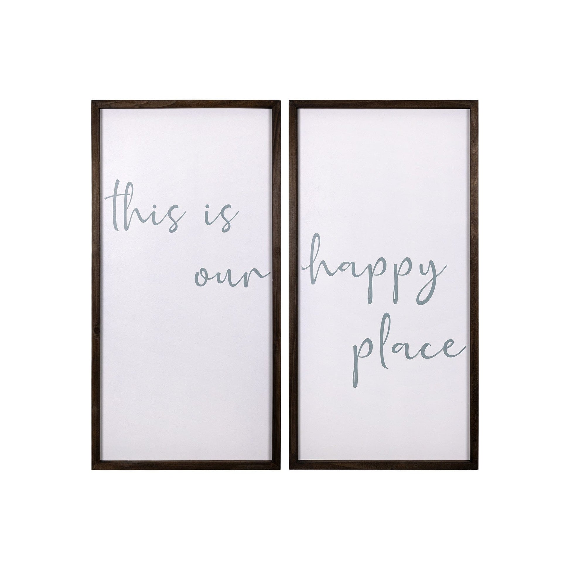 Add some warmth to your home with this Two Piece This Is Our Happy Place Wall Art. This wall art is made up of two separate frames that join together to make one complete piece. The frames are made of wood and are colored to a black finish. The shape of each frame is rectangular. Inside the black frames there are white backgrounds that have the font on top of them. The first frame has the words 'This is Our' on it while the second frame has the words 'Happy Place' on it. You can use this wall art anywhere in your home and add some warmth to the whole space. 36" H x 18.13" W x 1" D