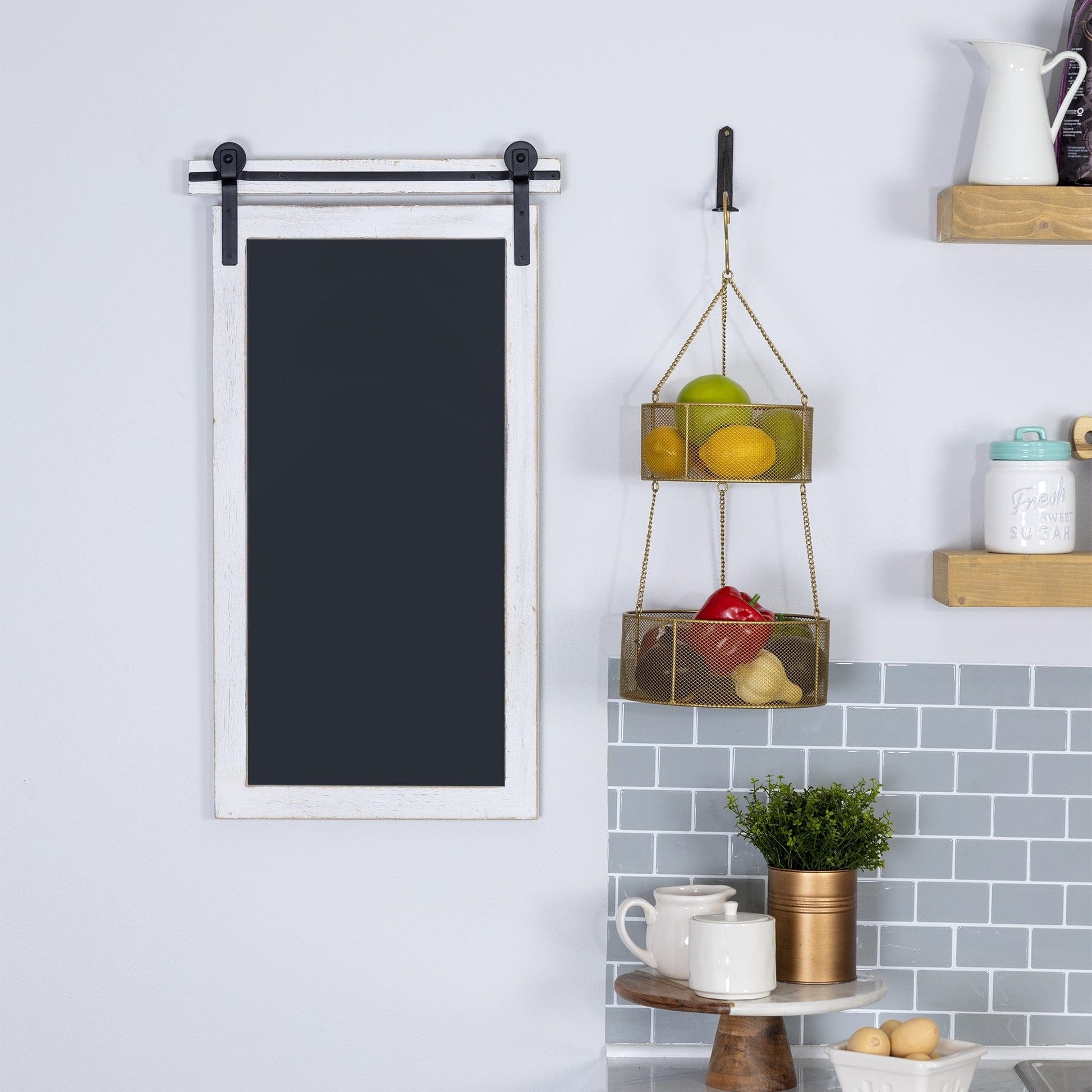 With this Two Tiered Gold Metal Hanging Basket you can add stylish storage to any room in your home. This basket is made from solid metal and is finished to shiny matte gold color. There are two baskets connected with three thin gold metal chains. Above the smaller basket on top there are three thin gold chains that connect to a gold hook that allows you to hang it up easily. The baskets have a wire mesh design which help create an airy feeling as well as securely holding all your items in place. These hanging baskets can be used as decor anywhere in your home or they can be used to store fruits and vegetables in your kitchen. The uses of these hanging baskets are endless. 22,75" H x 9" W x 9" D
