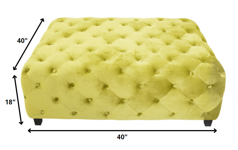 Introduce a touch of luxury to your living room with this stunning Velvety Green Modern Square Coffee Table that will serve as a practical piece while being a decorative accent on its own. Beautifully upholstered in plush yellow-green velvet with button tufted detailing for visual intrigue and the brown wooden legs add a hint of contrast to the piece. This coffee table is a versatile piece of furniture to hold drinks, books, or other accessories in style and sophistication while enhancing your contemporary home with pops of bright hues. 40” x 40” x 18”