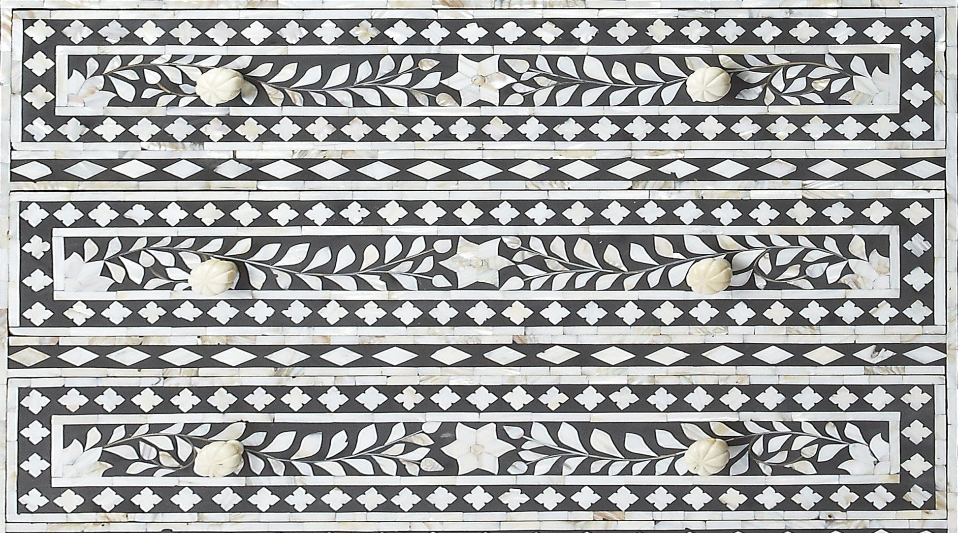 Sophisticated artistry and craftsmanship go into the detailed botanic and geometric pattern on the drawers, top and sides of this delightful chest. White mother of pearl inlay individually cut and applied against a black background make each dresser a bonafide original. The chest boasts three storage drawers , ideal for a child or teenager's room and equally at home in the dressing room or sitting room.