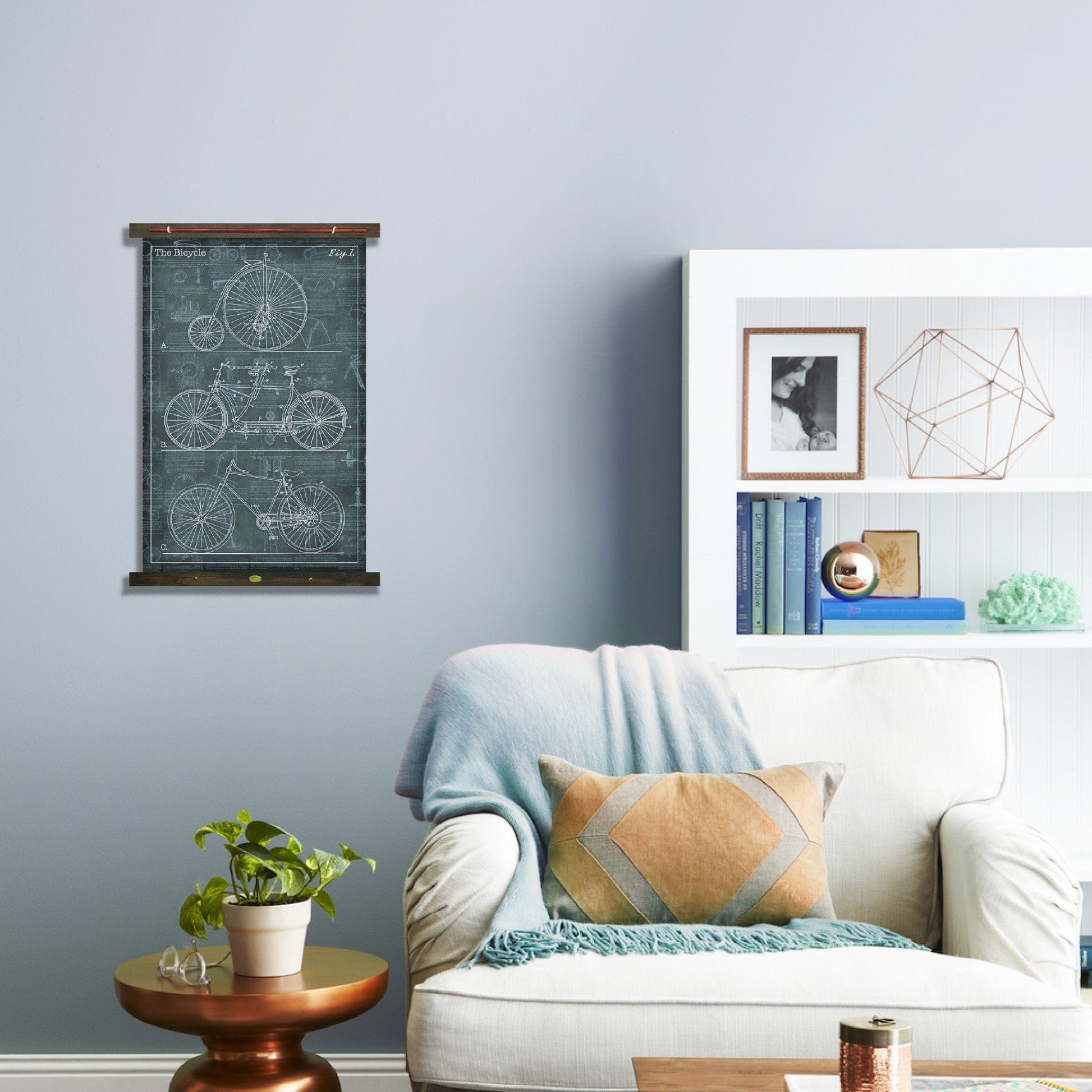 For bike lovers, the Vintage Blue Print of The Bicycle Wall Canvas Tapestry Art features three detailed bicycle drawings in White on a Charcoal background. This wall art hangs from a decorative white rope hanger and is complete with wooden bars on the top and on the bottom to give it that vintage look. Vintage BluePrint of The Bicycle Wall Art is a unique look for living room, office space, or bedroom. 45" x 30" x 1"