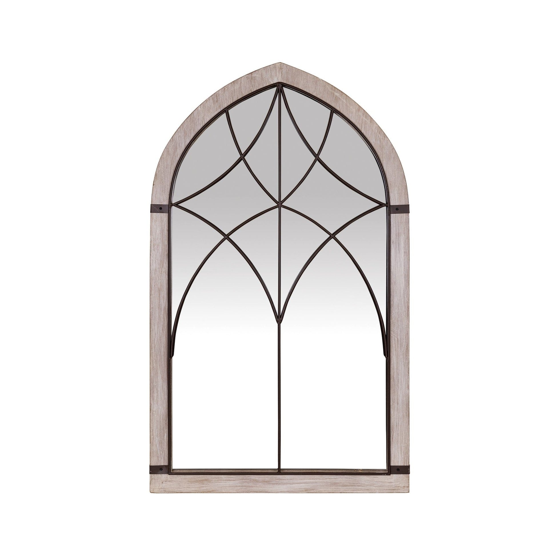 With this Vintage Wood and Iron Wall Mirror you can make any room in your home brighter and more open. The shape of the mirror is a straight edged arch with a point at the top. The frame is made of wood and has a light gray lacquer on it which allows the wood details and grain to show through. On the inside is a mirror that follows the same shape. On top of this mirror there are iron rods that make a vintage inspired geometric pattern. The mirror is also encased in an iron frame which has two hooks at the top and the bottom connecting it to the wooden frame. You can use this mirror as a decorative mirror or as a vanity mirror. 40" H x 24" W x 1.25" D