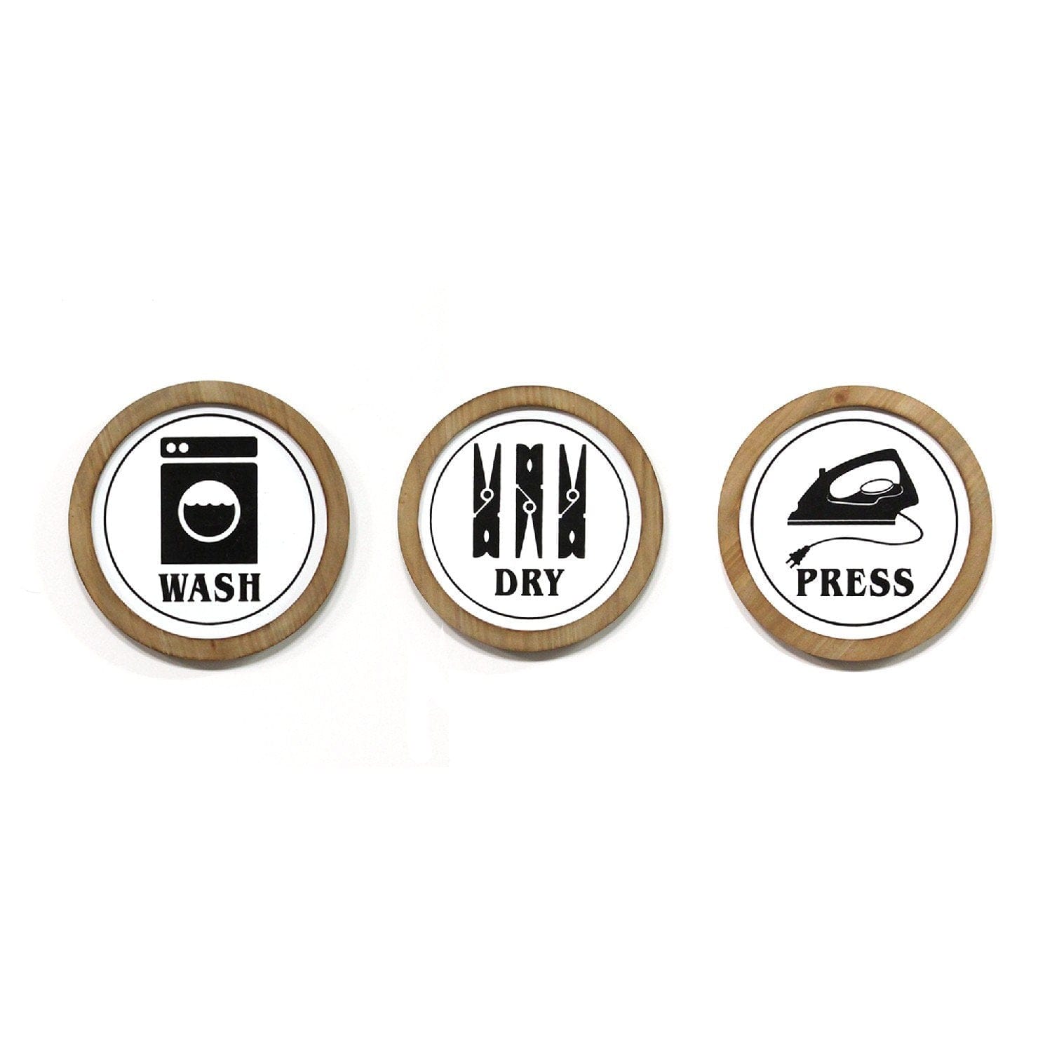 Spruce up a laundry area with fun, trendy signage with this Set of 3 "Wash" "Dry" "Press" Wall Decor. This trio of black and white round wood frames featuring the images of a washer machine, clothespins, and iron symbols along with the words, "Wash," "Dry," and "Press" brings the room to life with modern rustic flair. Each measures 10" W x 0.50" D x 10" H and comes with a sawtooth hook on the back for easy hanging.