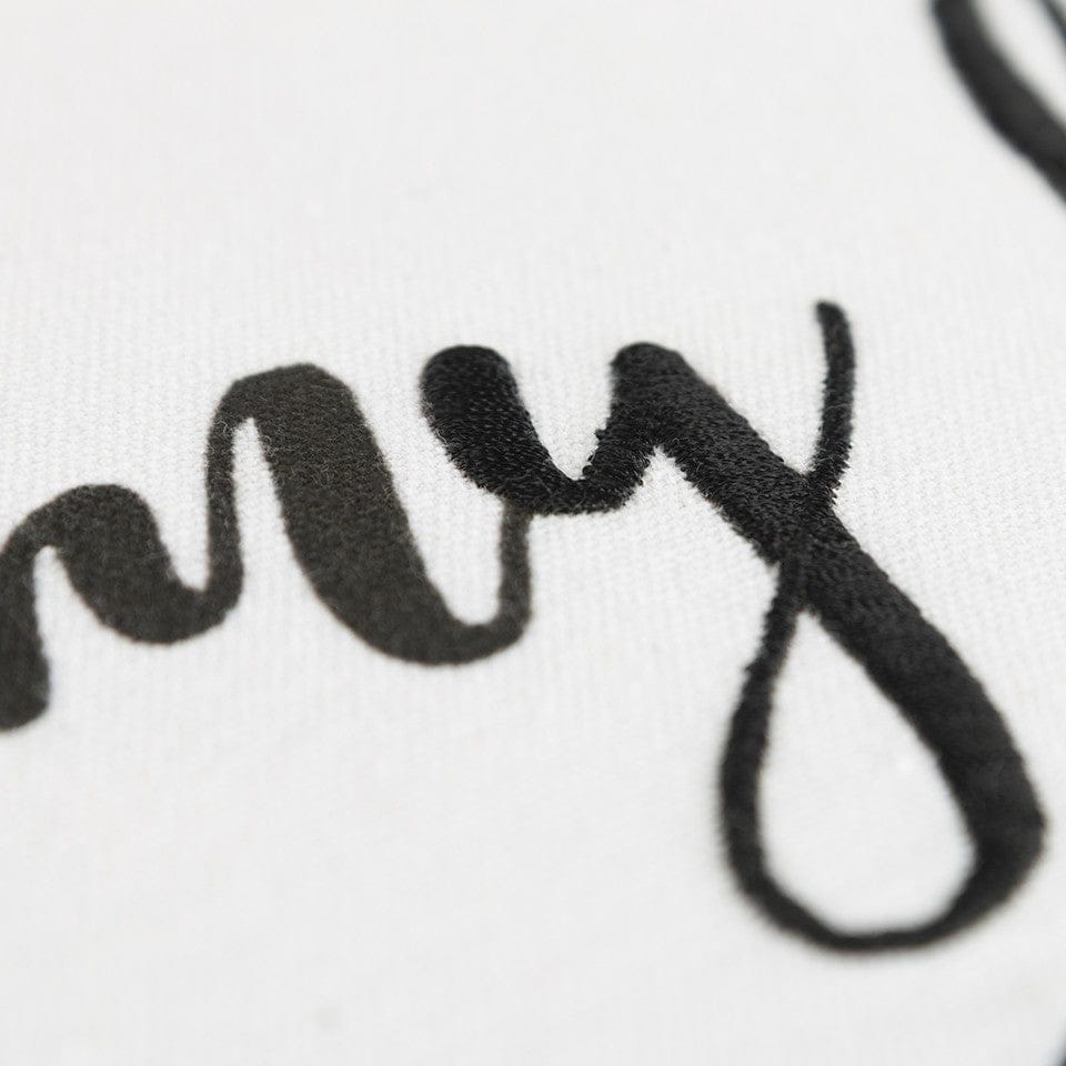 There is always one person in an office setting that just doesn't pay attention therefore prompting a reminder, "per my last email". We find it a wonderful relatable point of humor. Black print and accent embroidery on crisp white cotton duck, this pillow is framed by contrast black welting, framing this sentiment. Dont remind your co-worker again- just send them this wonderful pillow! The solid crisp white cotton duck back features a hidden zipper closure for ease of fill