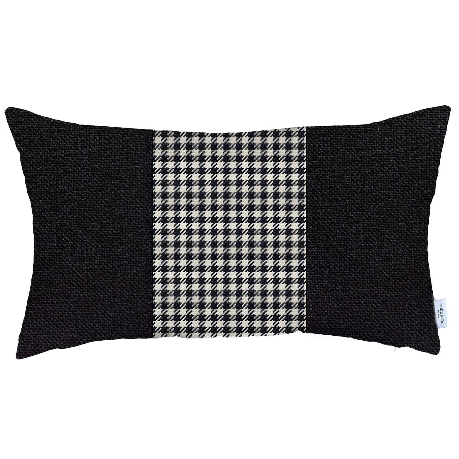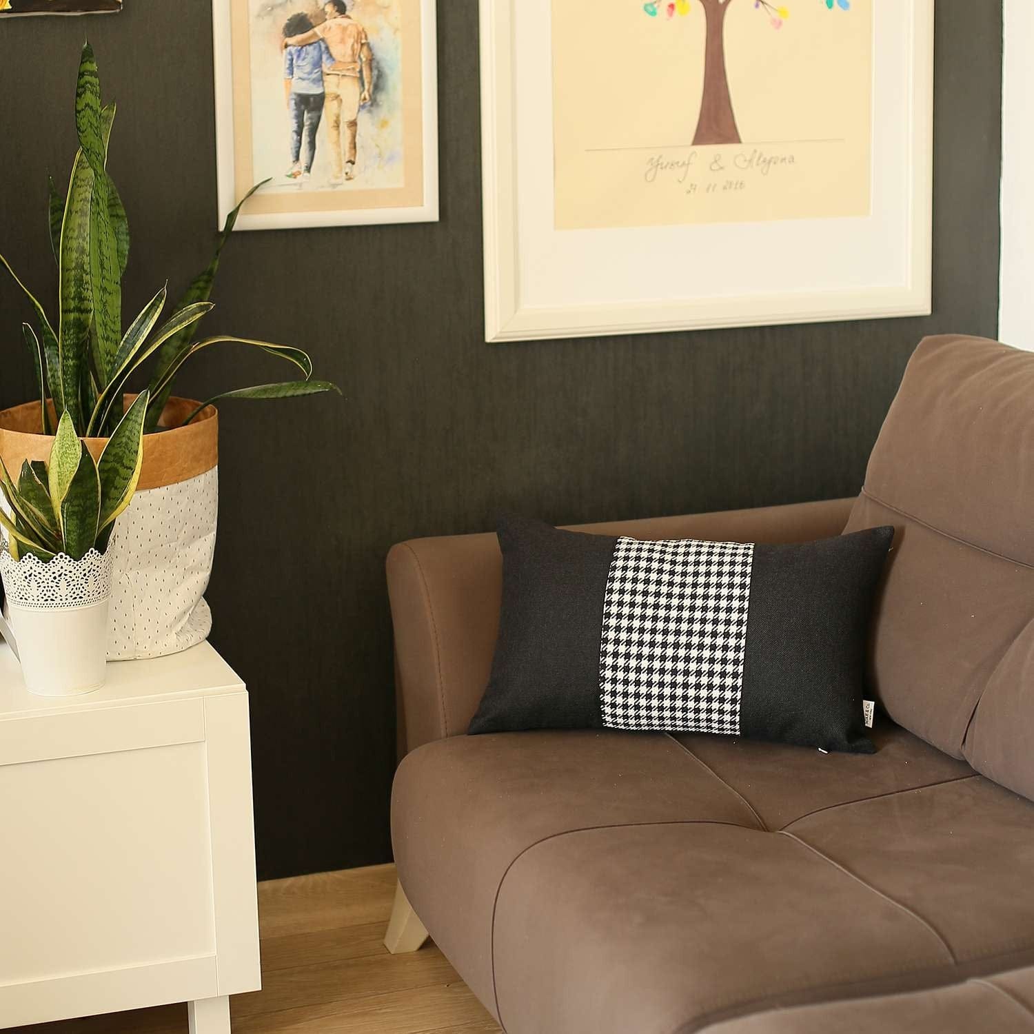 Embodying the beauty of modern artistry, this White and Black Houndstooth Lumbar Throw Pillow will bring an elegant touch to your contemporary décor. The black and white jacquard weaved houndstooth pattern in the center of the matte black base creates an alluring visual experience. Durability and longevity is ensured by fine Turkish craftsmanship with OEKO-TEX Standard 100 certified polyester fabric. The handmade pillow only needs to be spot cleaned to keep it looking pristine for ages. To give it a seamless and uniform look, the zipper is kept in a hidden closure. The eco-friendly and nonallergenic insert is not only easy to clean but also provides a soft and cozy feel to the touch. Your modern home will look its best with this decorative throw pillow while helping you express your love of classy patterns. 12” x 20” x 1”