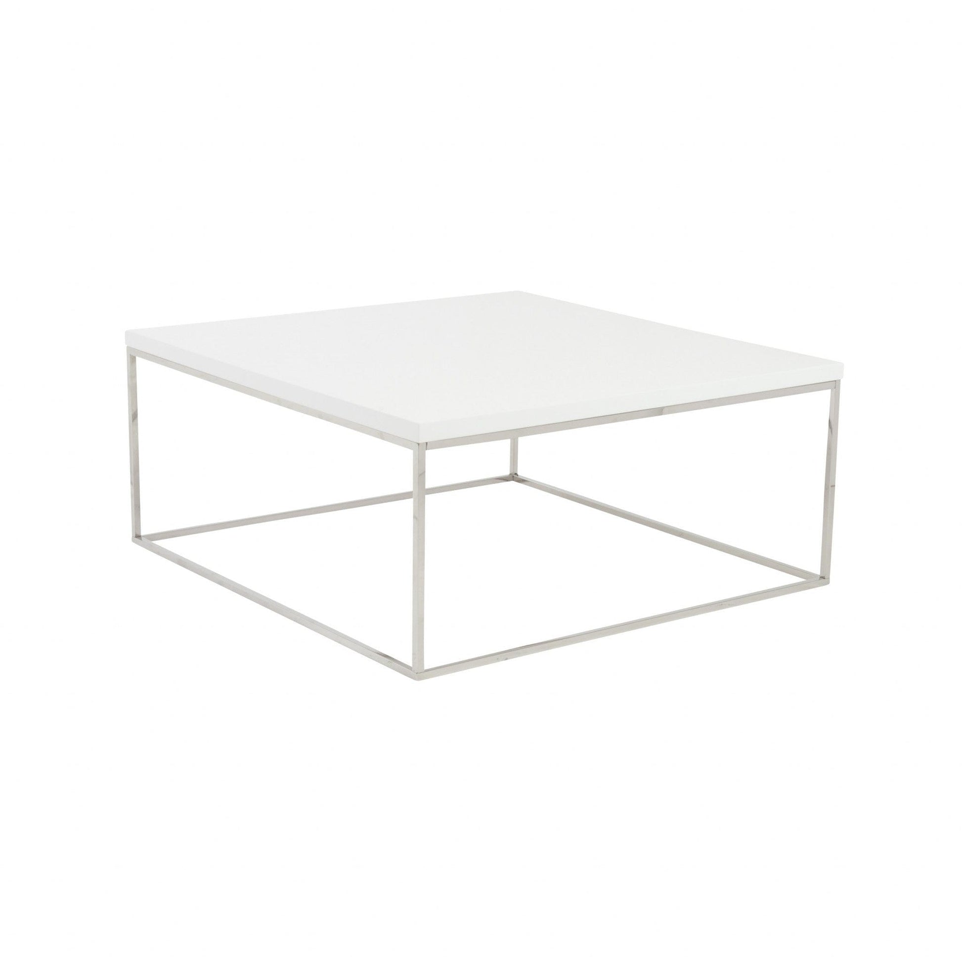 Add a touch of contemporary design to your living room with this White and Chrome High Gloss Square Coffee Table. The geometric and minimalist base of this table is made from steel and is polished to a shiny silver chrome finish. The gorgeous square table top is made from super sturdy high gloss lacquered white mdf that is not only striking but durable and unique as well. This table is simple and classy and will look great in most any contemporary or modern space. 15.75" H x 35.44" W x 35.44" D