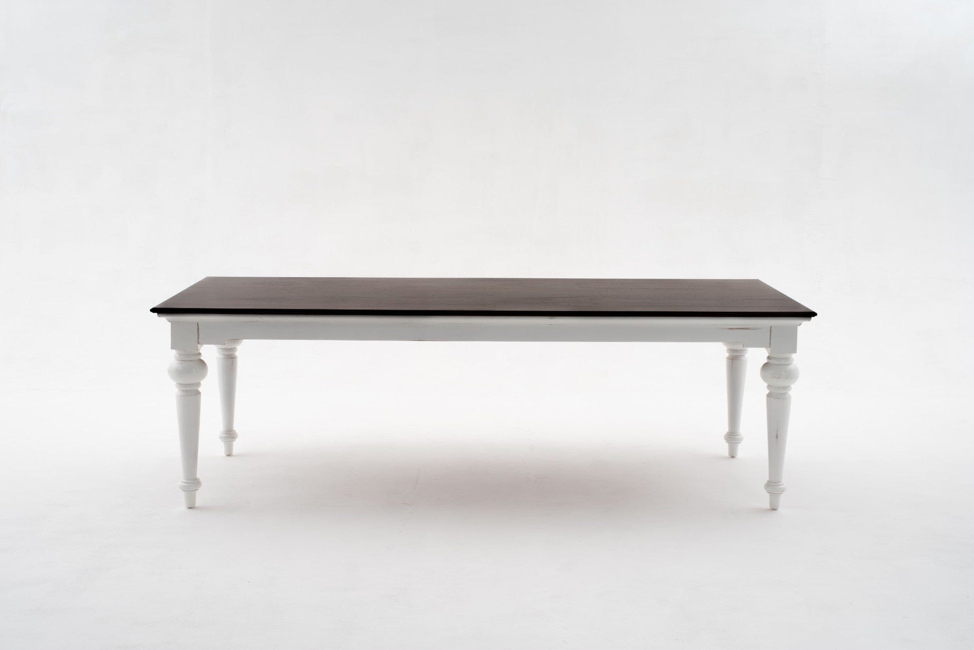 Make a statement during your meals with the White and Dark Brown Rustic Modern Farmhouse 94" Dining Table. The wide semi glossy table is crafted from mahogany wood with an ample amount of serving space for your favorite dishes. Four tall farmhouse trumpet-turned tapered legs lie skillfully beneath the exquisitely smooth brown table providing a slender and sturdy base. The deep dark brown finish creates a perfect contrast to rustic distressed white finish. The rustic and chic combination allows you to fit it perfectly into any style of decor. 29.92" x 94.49" x 39.37"