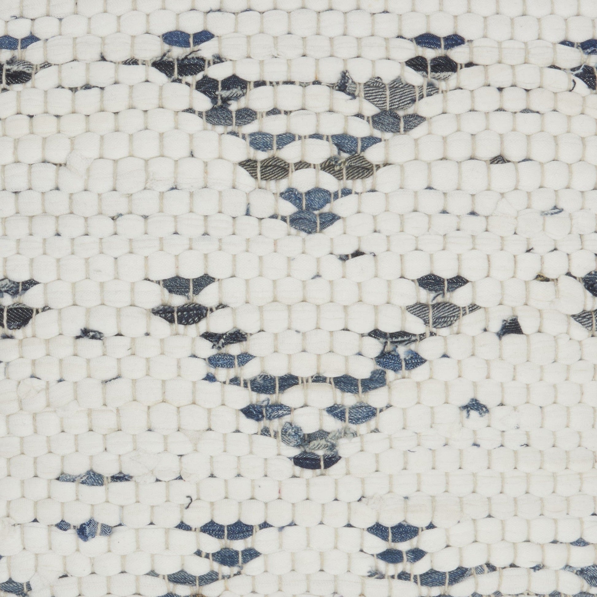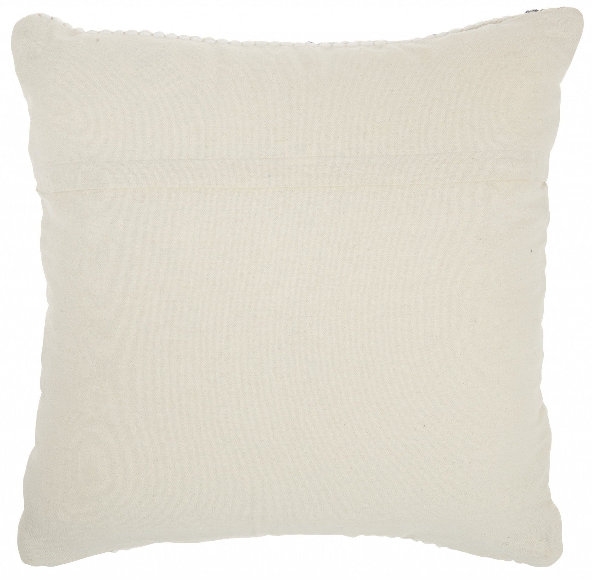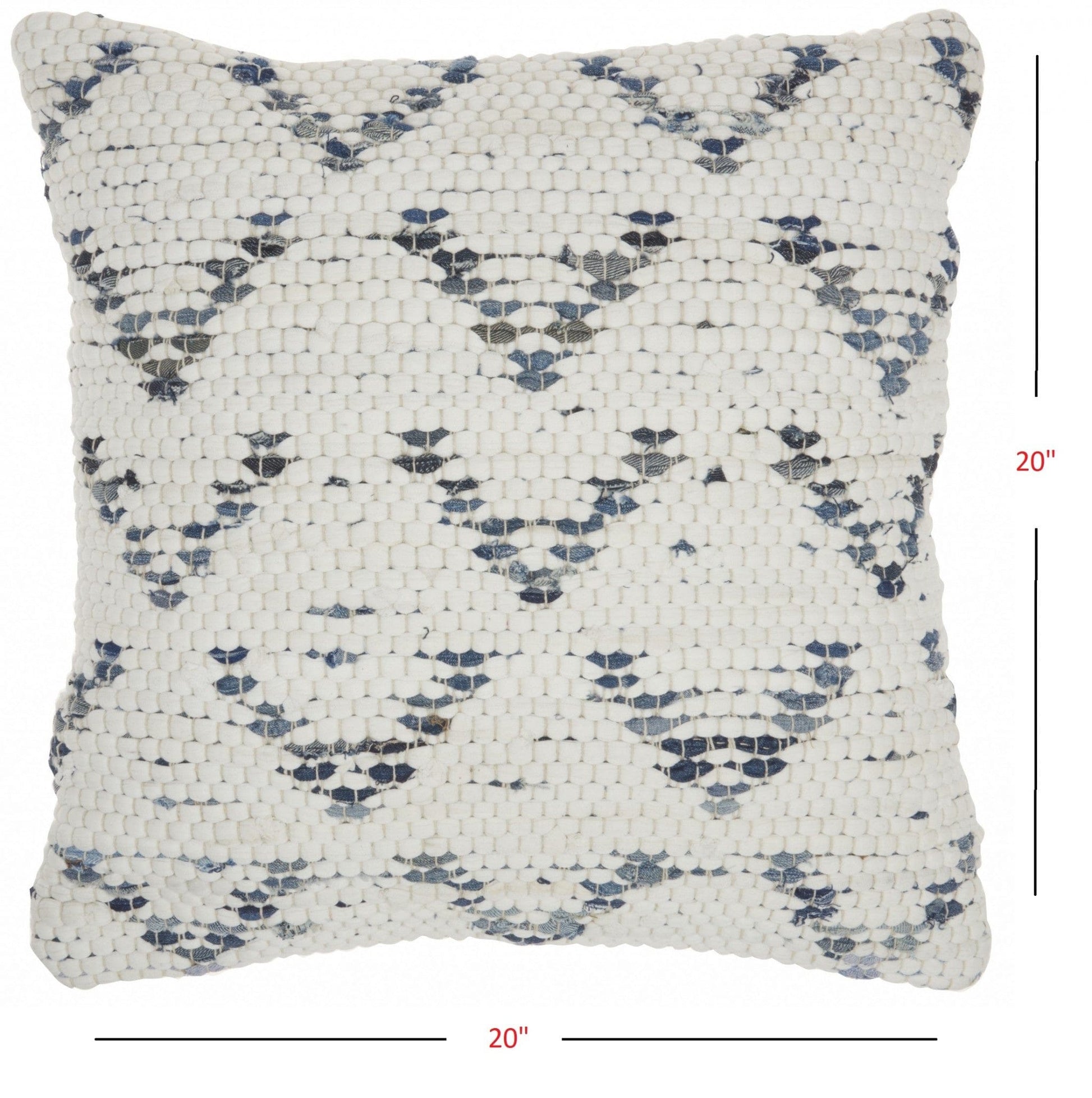 Give your seating space or bedroom a unique and cool casual vibe with this White And Denim Knubby Waves Throw Pillow. Modern and minimalist in its color palette and design pattern, this pillow showcases distressed downward arrows in denim over a textured white knubby honeycomb backdrop creating a mesmerizing visual appeal. Made with 100% cotton, this textured throw pillow will stand the test of time while providing the utmost in comfort and relaxation in your home. Tie your room together with the subtle sophistication of this accent that is made to complement the nonchalant look of any casual interior. 20" x 20" x 5"