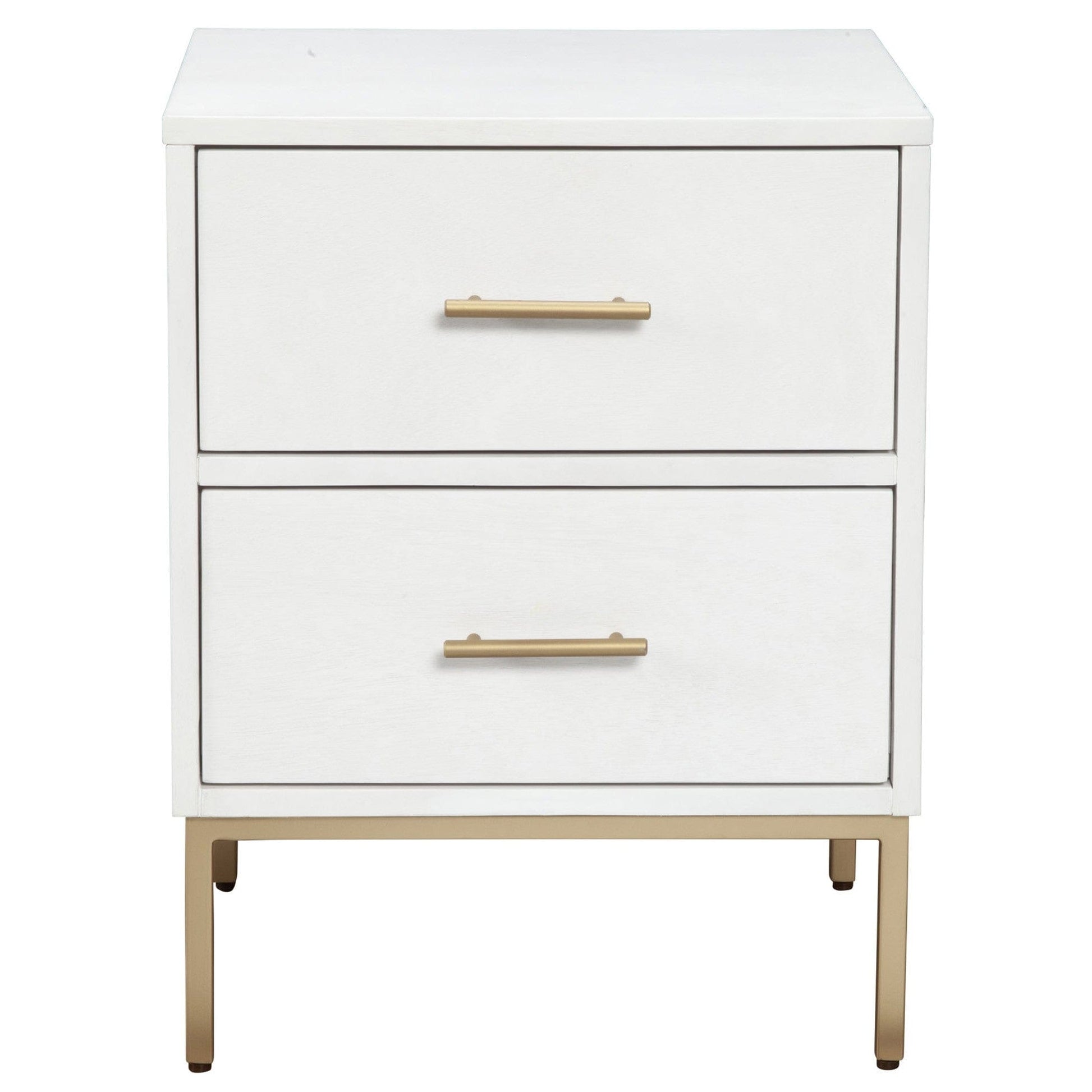 Give your bedroom a stylish and modern look with this White and Gold Lines 2 Drawer Nightstand. This nightstand has a white finish, with thin line gold metal accents and is expertly crafted from mahogany wood solids & veneer. It has ball bearing metal 2 drawers that is great for storage and legs that raise it up off the floor for an overall modern sensibility. It hints at subtle refinement, without overpowering your current decor. It fluidly fits in with a variety of aesthetics and color schemes to compliment your bedroom setting. 26" x 20" x 15".