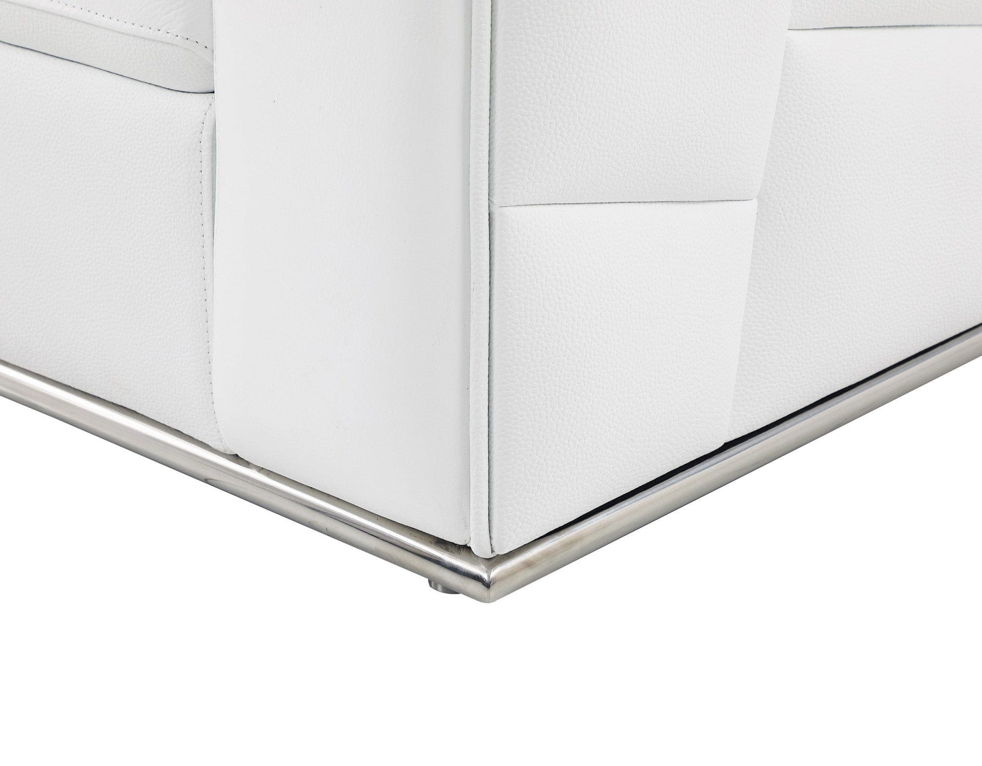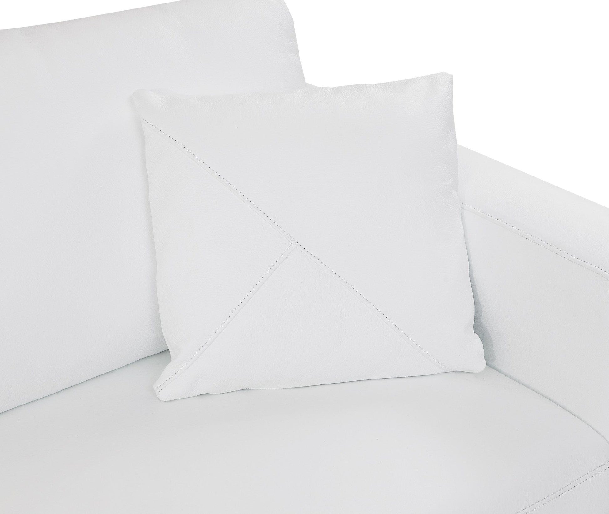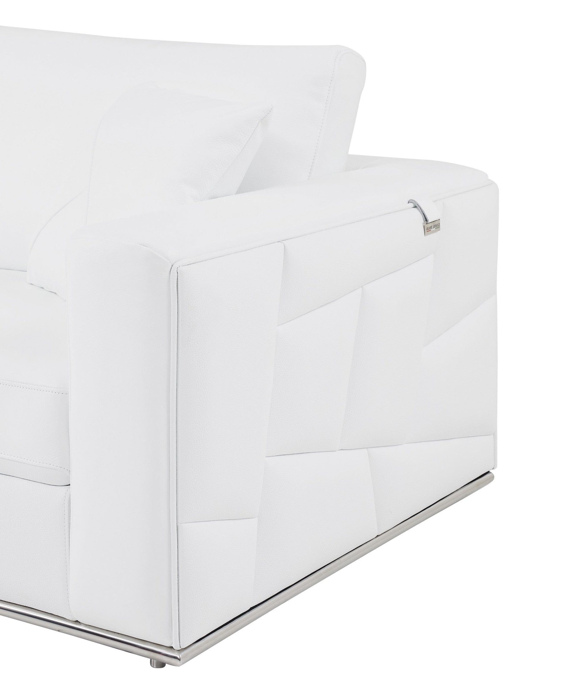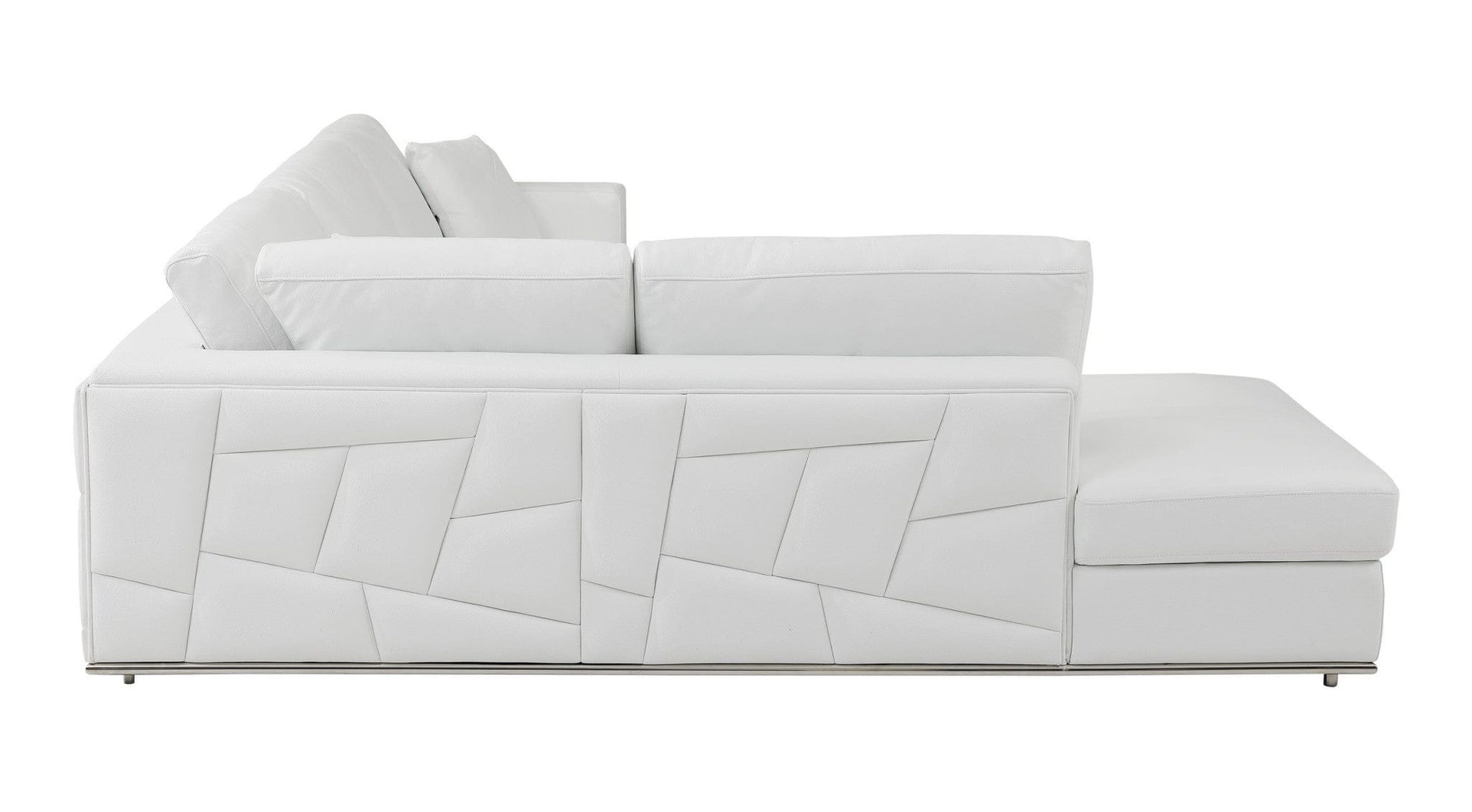 Superior construction from fabulously soft and high-grade leather gives this white Italian leather modular l shaped two piece corner sectional a leg up on the competition. The premium leather used makes your lounging luxuriously comfortable and adds an elegant appeal to your space. Square arms offer a comfy place to rest. Chrome metal legs effortlessly elevate the room and add a touch of contemporary design. This sectional features a short loveseat-style couch that intersects with a long chaise creating a L-shape. Great for everyday lounging and for entertaining, sectionals are an ideal way to seat multiple people. 35" H x 117" W x 40" D