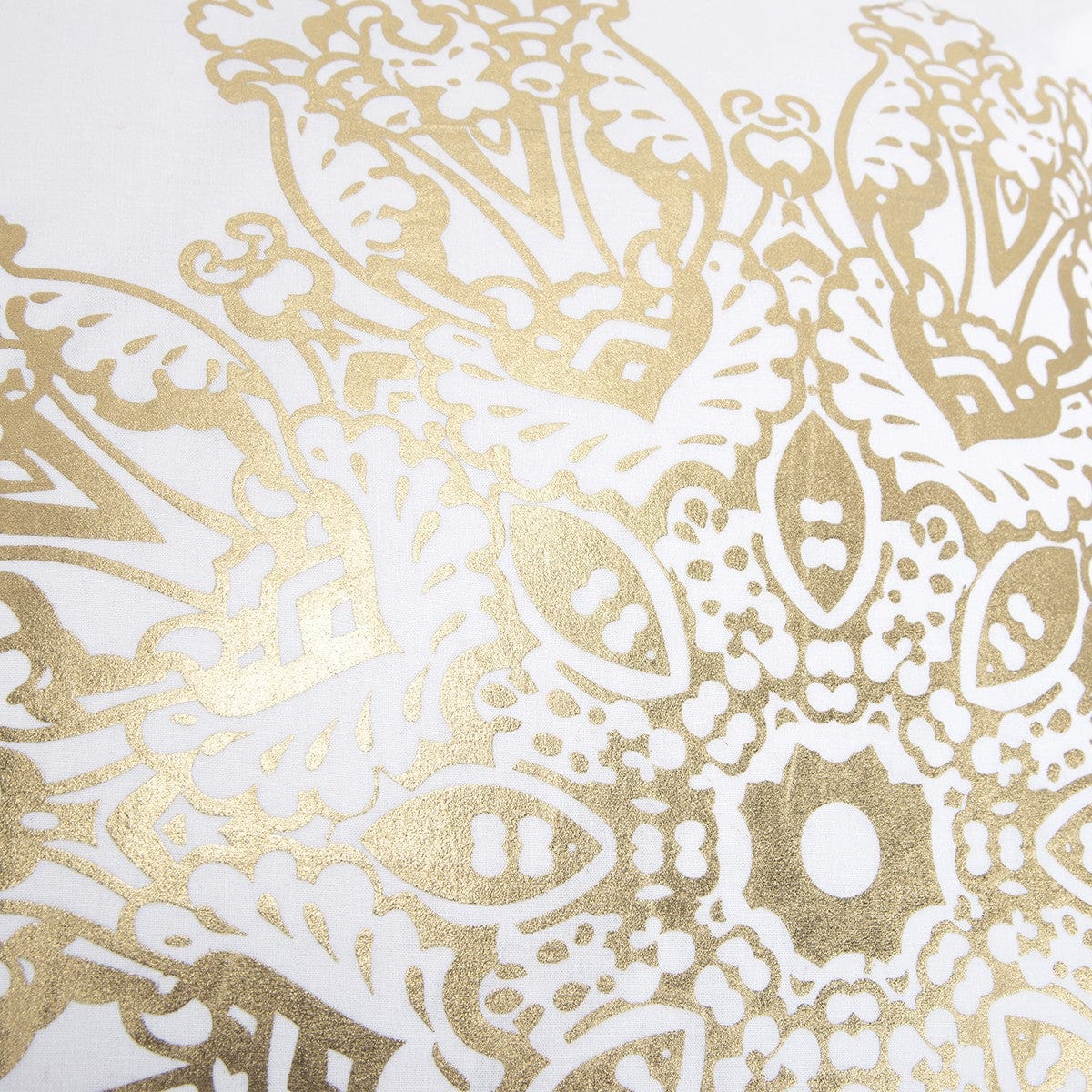 Enliven your boho-chic living space with this stunning White Gold Medallion Down Filled Throw Pillow that exudes a timeless festive vibe to be a delightful addition to any room. The metallic gold-toned foil print showcases an asymmetric medallion with intricate detailing over a white background, giving the pillow a sense of luxury with a modern poise. This down filled pillow is crafted with high-quality cotton, making it softer and loftier for maximum support while ensuring optimum durability to last for years. The knife edge gives the pillow a clean and polished look while the solid white coordinating back features a hidden zipper closure for a seamless finish and ease of cleaning. Add style and charm to your living room with this versatile throw pillow that features delicate patterns in a trendy color palette to spruce up any modern or traditional space. 18” x 18” x 6.25”