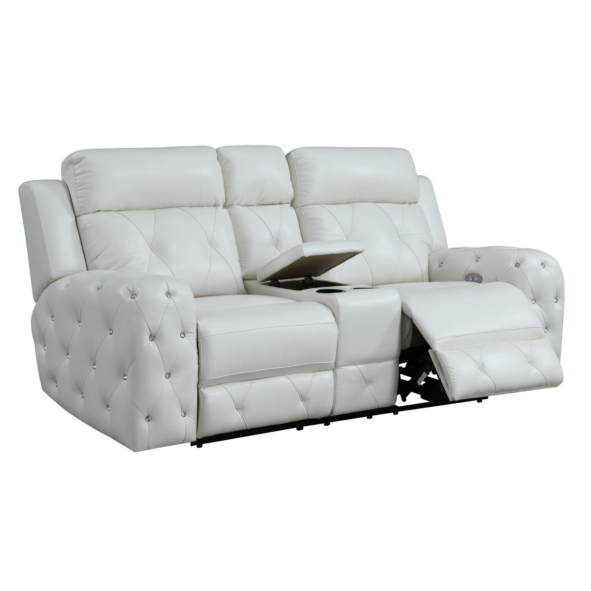 White Leather Gel Cover Power Console Reclining Loveseat In Plushily Padded Seats Jewel Embellished Tufted Design Along With Recessed Arm