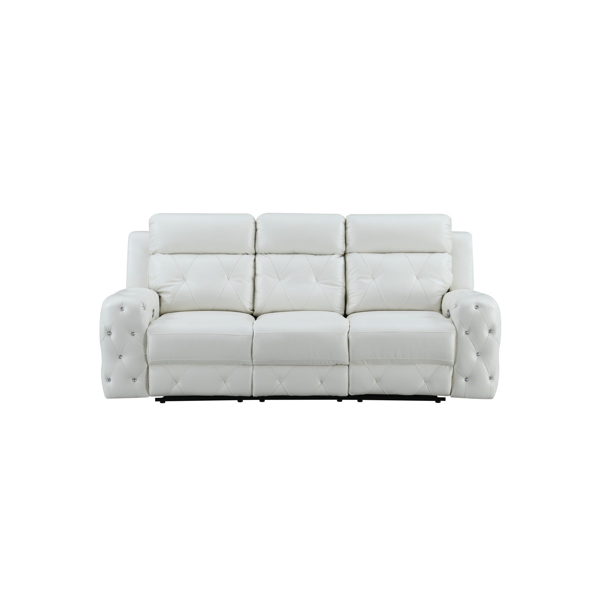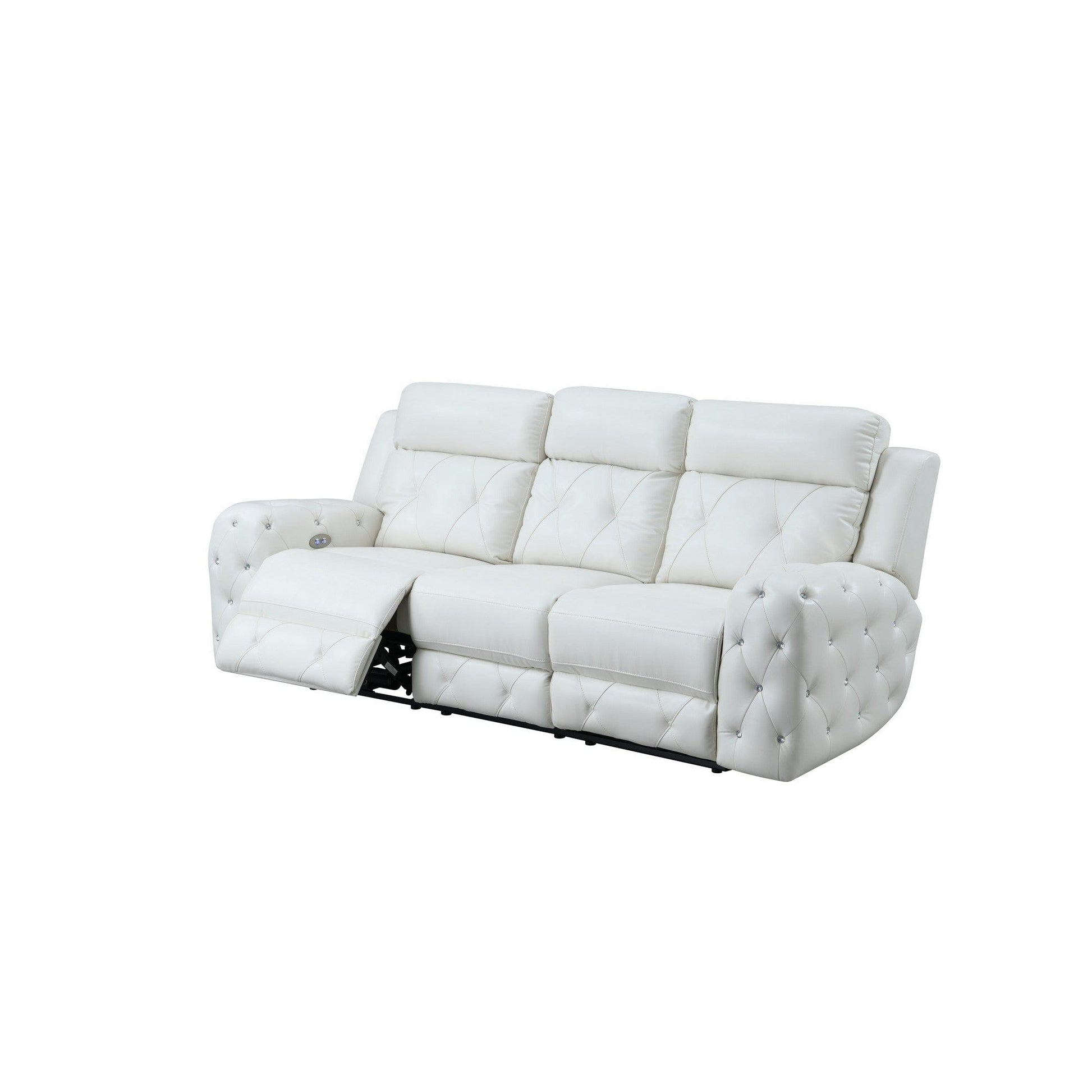 Comfortable design happily meet in this stunning power reclining sofa. This roomy yet compact sofa is offered in rich white leather gel material which makes this sofa an easy fit for many room decor settings and style choices. Additional features include plushily padded seats, jewel embellished tufted design, along with recessed arm styles that contribute to the overall relaxing feel and luxurious look of this sofa. Quality craftsmanship in every facet of production ensures durability and long-lasting wear. To create an attractive and eye-catching focus for your living room/den/office without sacrificing the comfort you require, choose this power reclining sofa for the ultimate in superior home furnishings.