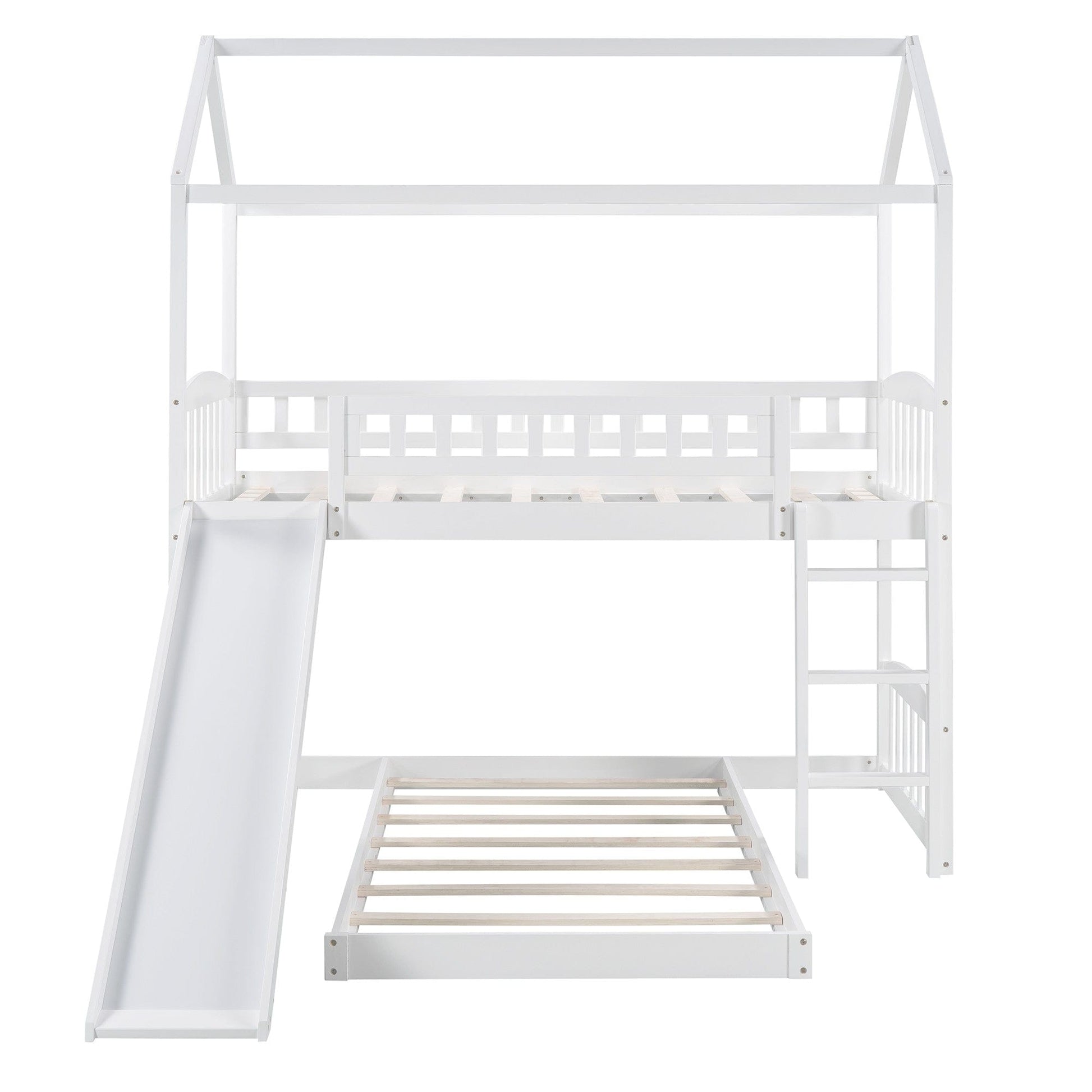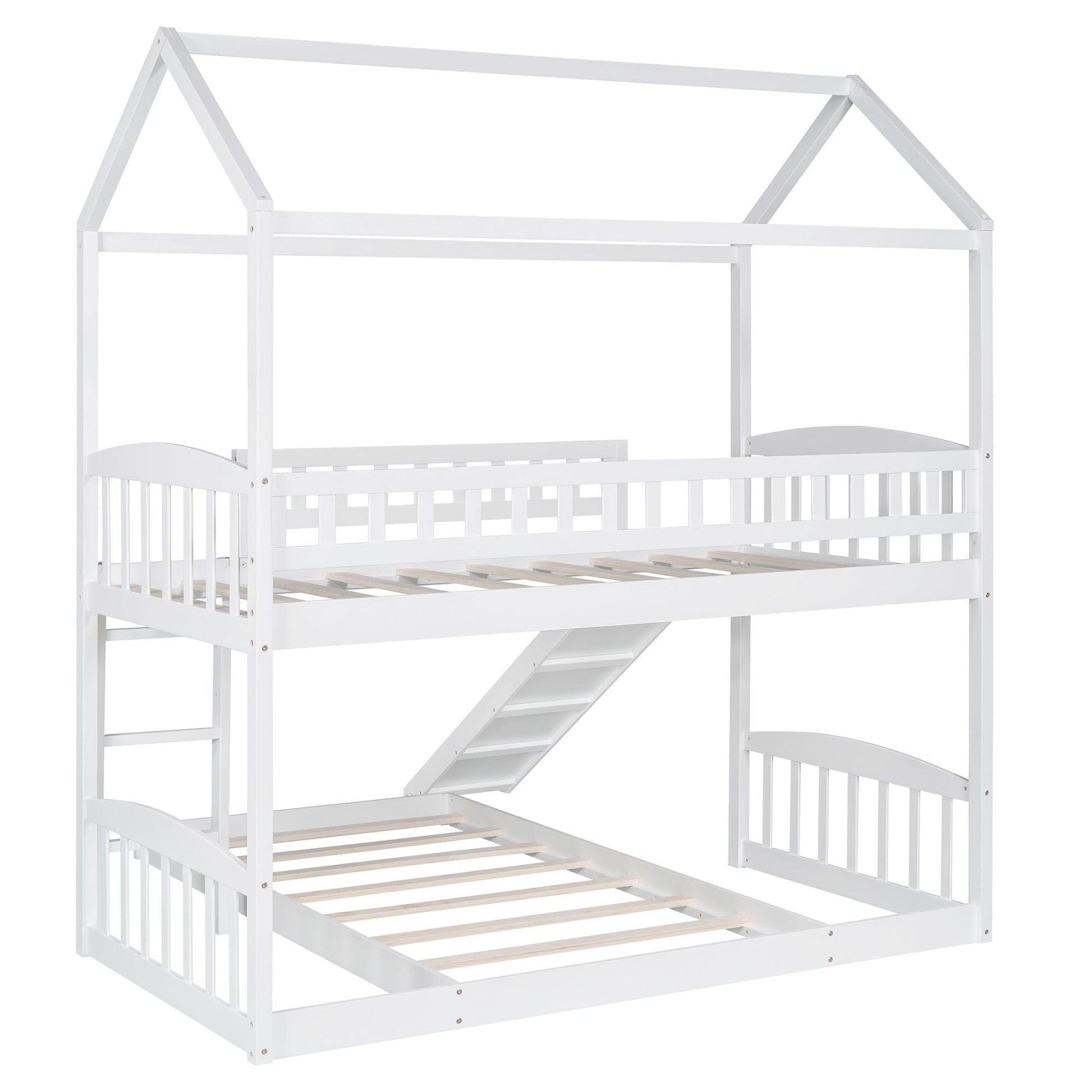 White Playhouse Frame Full Over Full Perpendicular Bunk Bed with Slide