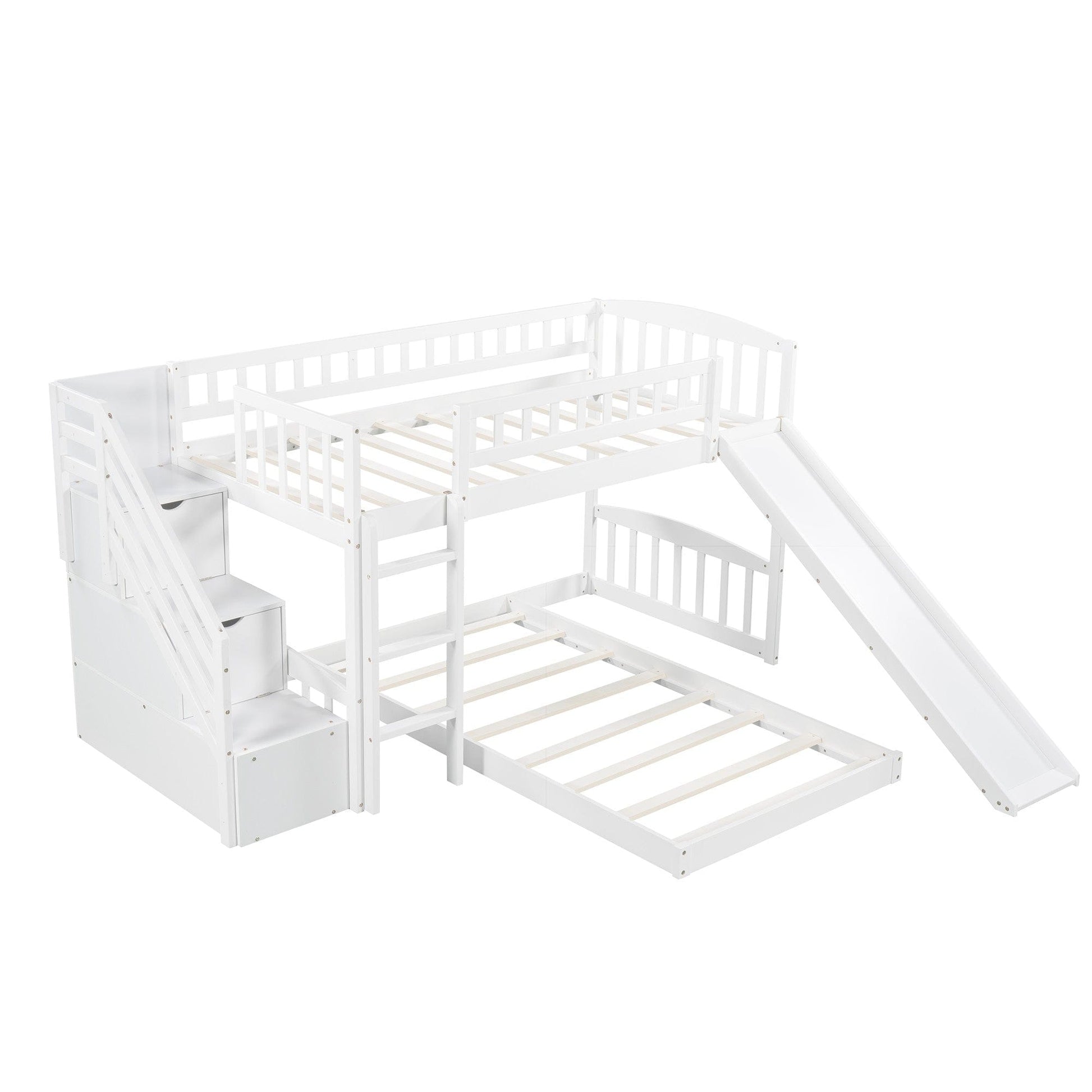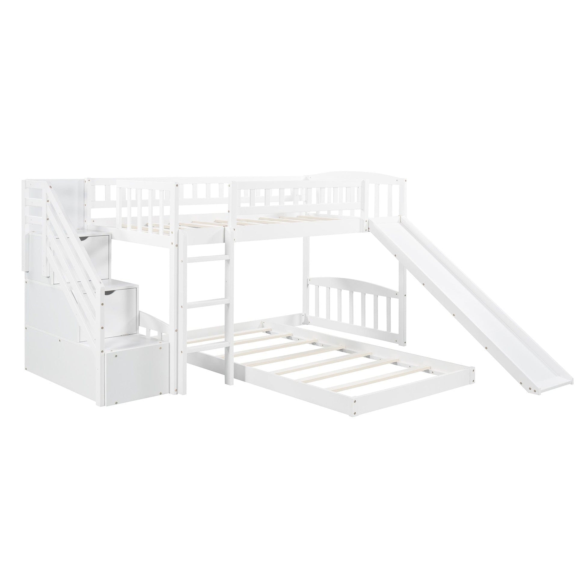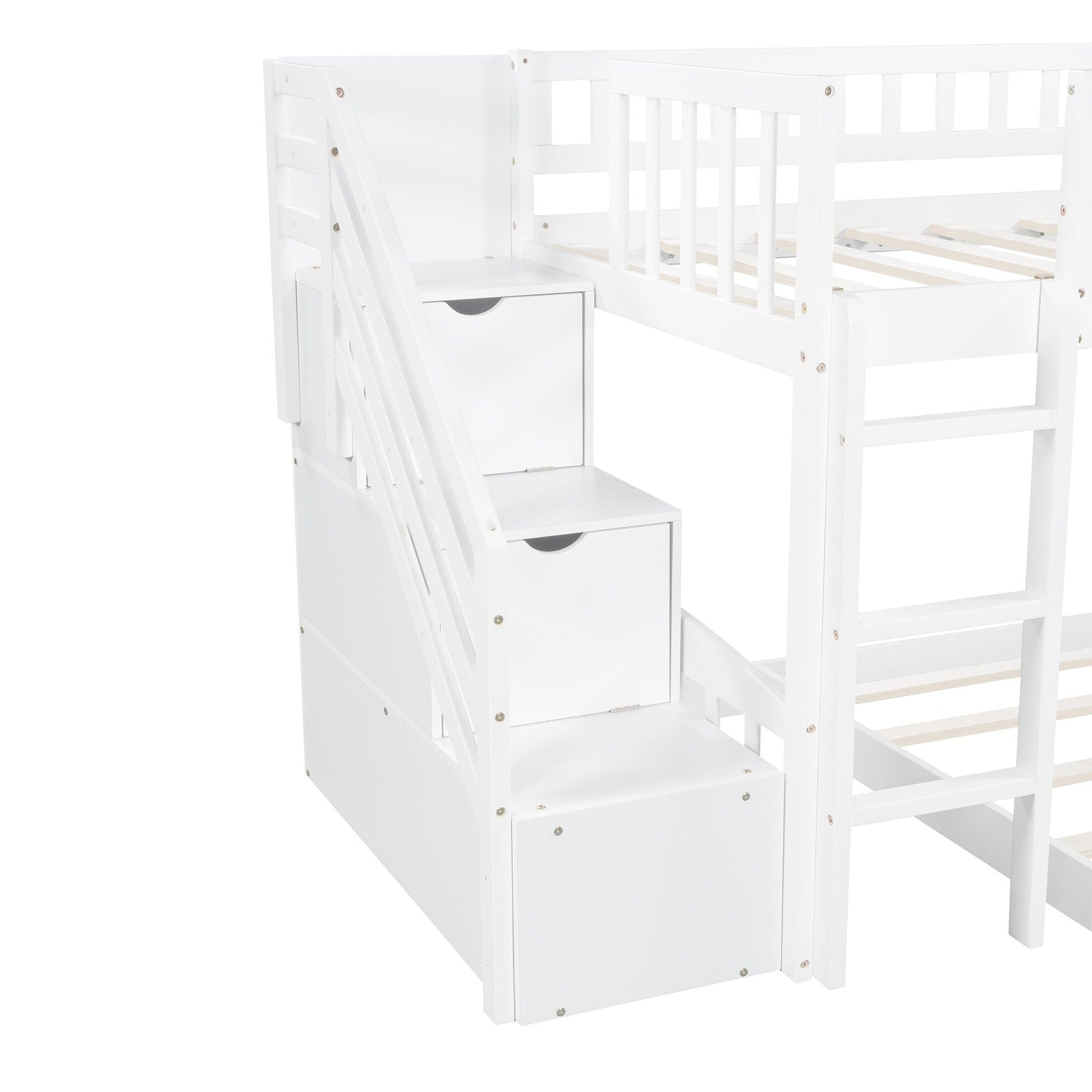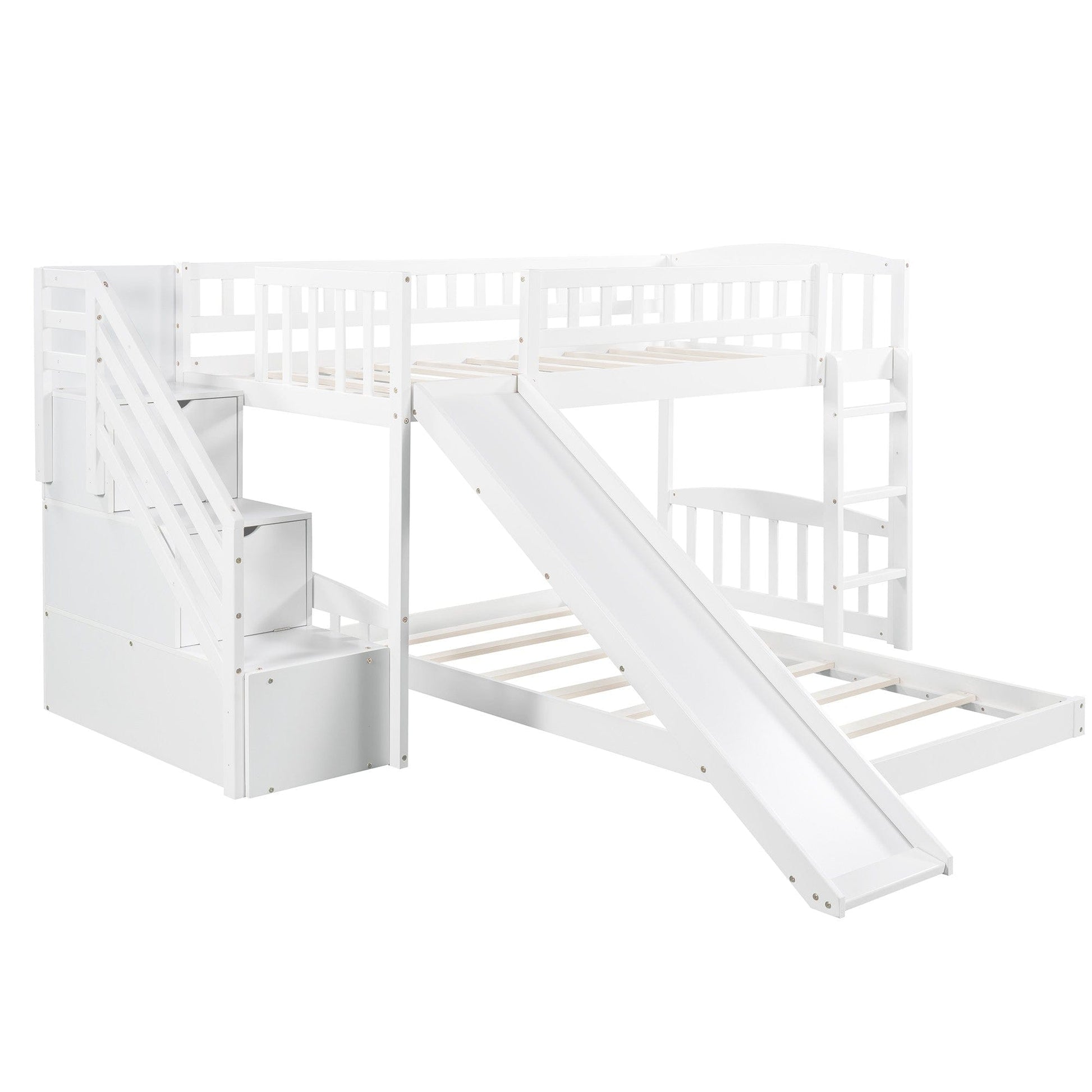 White Twin Over Twin Perpendicular Bunk Bed with Storage Stairs and Slide