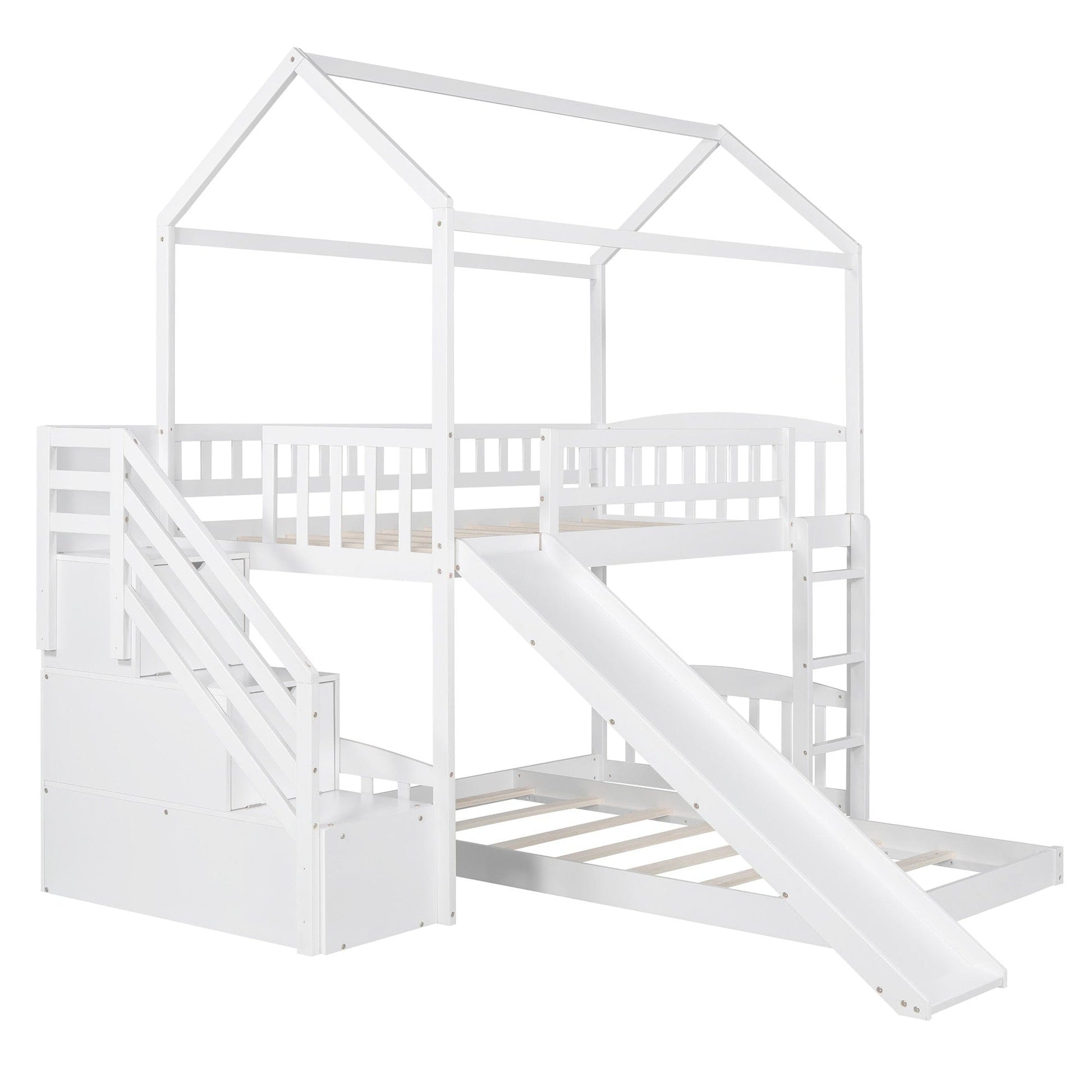 Entangle yourself in the fun and frolic of the White Twin Over Twin PlayHouse Perpendicular Bunk Bed with Slide. This fashionably cool bed features a solid frame constructed from MDF and pinewood with iron alloy bolts keeping everything balanced and wobble free for a long period of time. Whimsical in design, this magical bed includes a low vertically profiled bunk, a ladder, a box staircase with two drawers for ample storage of your toys, bedding or other odd items and a super fun slide for a thrilling experience. The upper bunk flaunts a clean, crisp silhouette with brackets and high side rails keeping children's safety in mind while the lower bunk is vertically proportioned to the entire structure, perfect to keep an eye on who's sliding down. Additionally both the upper bunk and lower bunk feature wooden mattress slats to increase the life span of your mattress and eliminate need for box spring. Refreshing in style, the trendy playhouse bed is equipped with a posh look that makes it ideal in complementing any type of decor. 84" x 42" x 94"