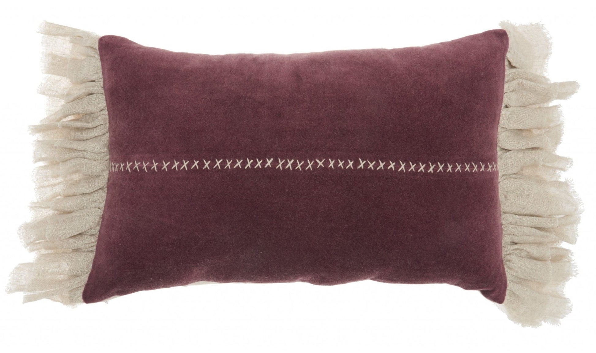 This Wide Tasseled Marble Maroon Lumbar Cushion is the perfect way to add some classic design to any seating space in your home without going too overboard. This rectangular pillow is covered in a vintage plush maroon fabric that has a marbled effect on it giving it a soft and luxurious feel. In the middle of this fabric there is a line of cream thread stitch detailing in the shape of small x-shaped stitches. This cream stitching matches the wide tassels that are on either side of this lumbar pillow. The tassels are made from textured net fabric and add a lot of body and movement to the overall look. The wide tassels in a beige color match the middle detail and look stunning with the maroon fabric. Lean into the brighter hues with this lumbar pillow and enjoy unmatched comfort. Use this lumbar pillow as part of your already existing pillow decor or as a statement piece on your favorite chair - the options are endless! 5" H x 14" W x 22" D