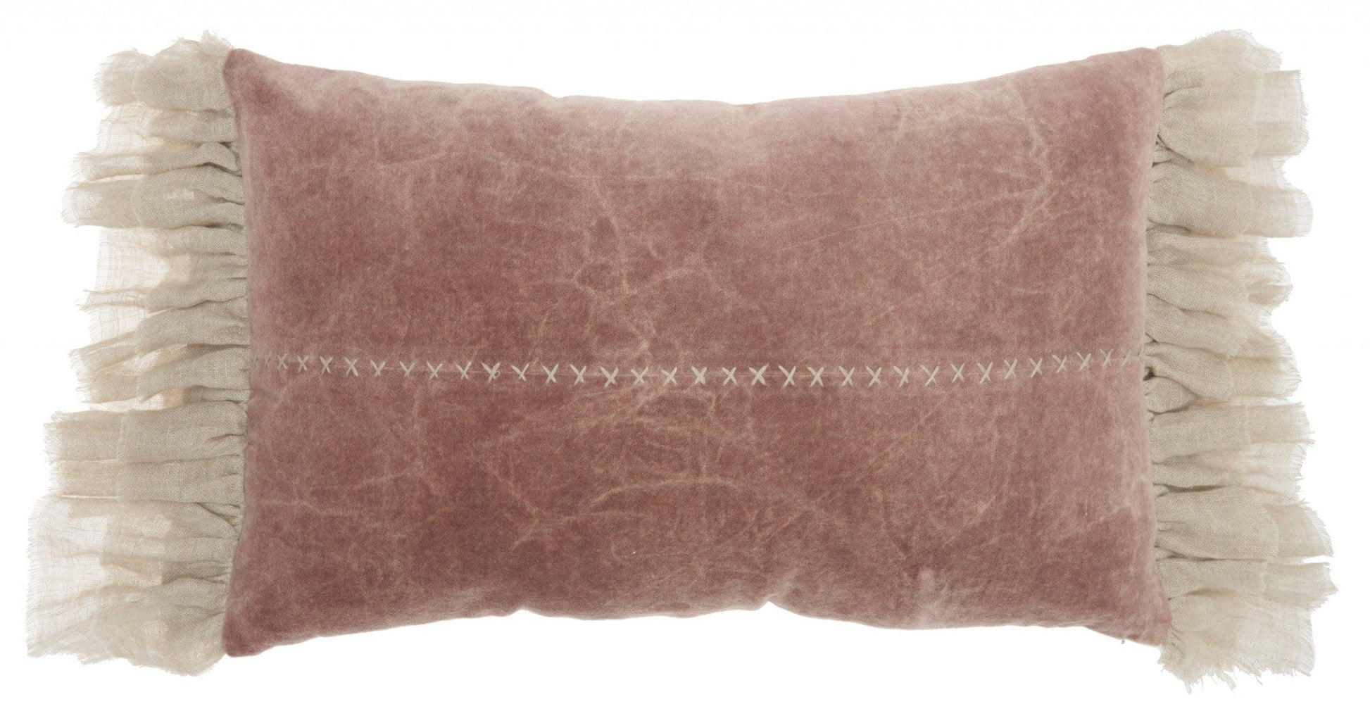 This Wide Tasseled Marble Pink Lumbar Cushion is the perfect way to add some classic design to any seating space in your home without going too overboard. This rectangular pillow is covered in a vintage plush pink fabric that has a marbled effect on it giving it a soft and luxurious feel. In the middle of this fabric there is a line of cream thread stitch detailing in the shape of small x-shaped stitches. This cream stitching matches the wide tassels that are on either side of this lumbar pillow. The tassels are made from textured net fabric and add a lot of body and movement to the overall look. The wide tassels in a beige color match the middle detail and look stunning with the pink fabric. Lean into the softer hues with this lumbar pillow and enjoy unmatched comfort. Use this lumbar pillow as part of your already existing pillow decor or as a statement piece on your favorite chair - the options are endless! 5" H x 14" W x 22" D