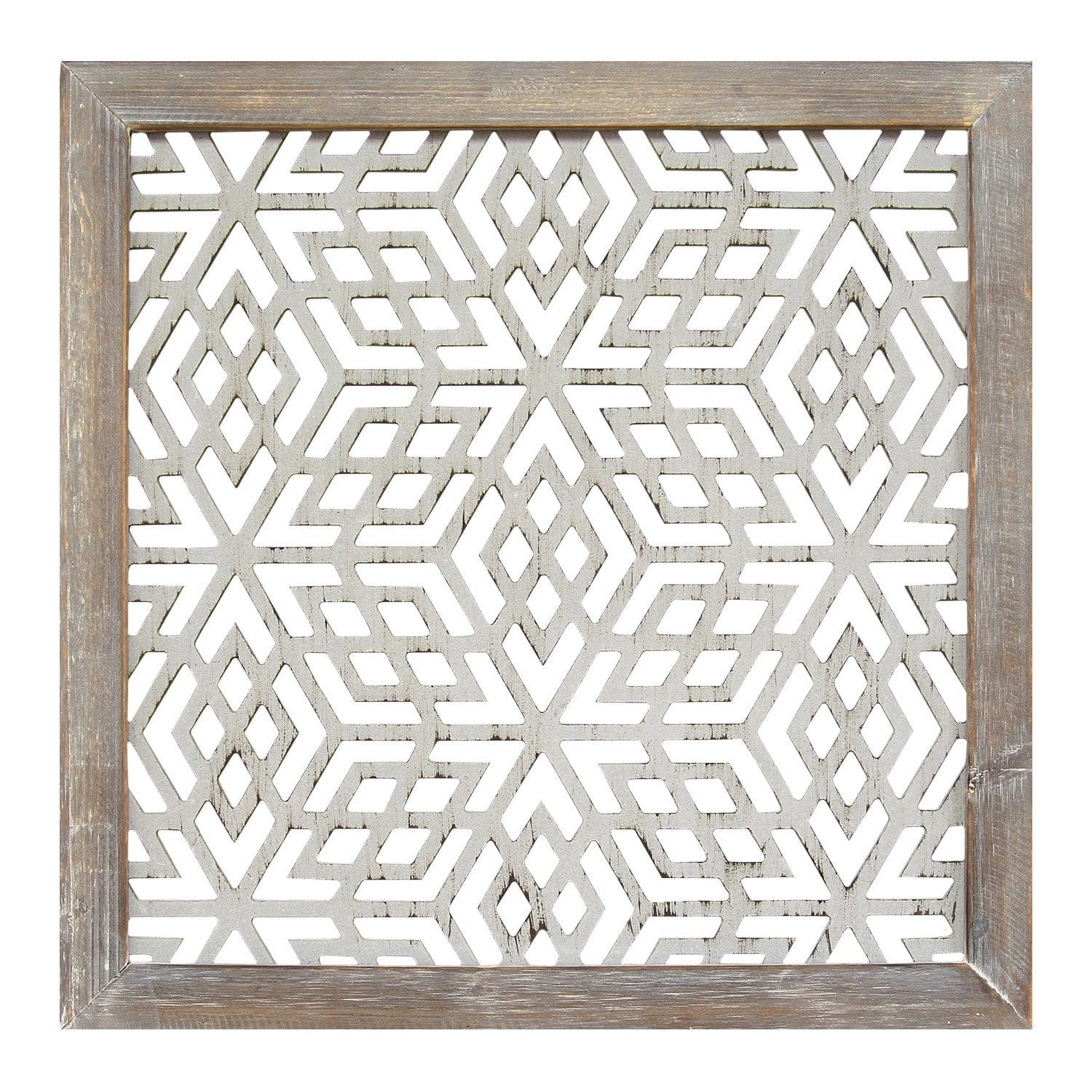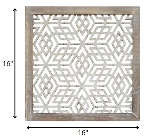 Add a spectacular scene to your home decor with this wood framed laser-cut wall decor. Our wall art is hand-painted to create a focal point in any room setting. Featuring a unique laser-cut metal piece with a touch of white and framed by a square wood edges in distressed gray finish to provide excellent visual vibes in a classic room setting. Traditional style - 50% Wood, 50% MDF Attached D-ring hanging method Vertical hanging orientation Wipe clean with damp cloth. It measures 16" X 1" X 16".