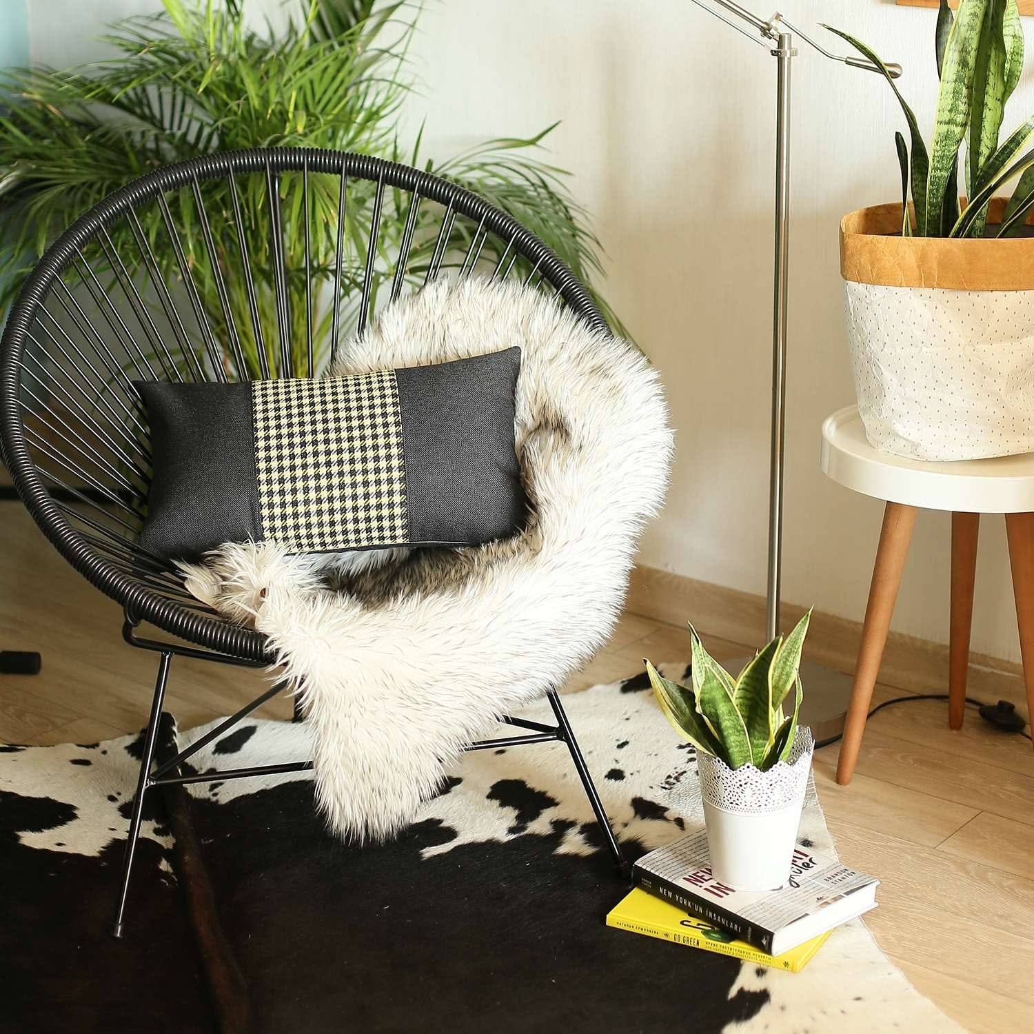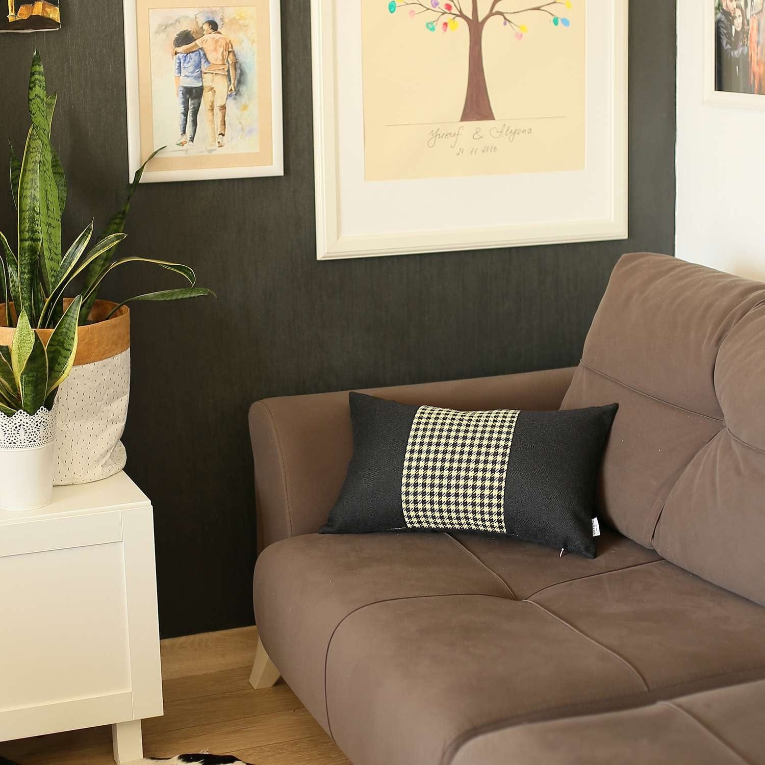 Embodying the beauty of modern artistry, this Yellow and Black Houndstooth Lumbar Throw Pillow will bring an elegant touch to your contemporary décor. The black and yellow jacquard weaved houndstooth pattern in the center of the matte black base creates an alluring visual experience. Durability and longevity is ensured by fine Turkish craftsmanship with OEKO-TEX Standard 100 certified polyester fabric. The handmade pillow only needs to be spot cleaned to keep it looking pristine for ages. To give it a seamless and uniform look, the zipper is kept in a hidden closure. The eco-friendly and nonallergenic insert is not only easy to clean but also provides a soft and cozy feel to the touch. Your modern home will look its best with this decorative throw pillow while helping you express your love of classy patterns. 12” x 20” x 1”