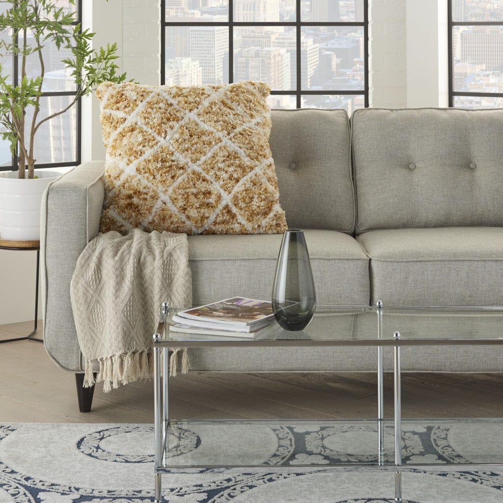 Bring in a touch of shabby chic design to your seating spaces with this Yellow and White Shaggy Chevron Throw Pillow which combined comfort and style beautifully. The pillow is covered in a shaggy fabric that has a yellow and white colorway. On top of this background there is a white colored chevron pattern. The comfortable fabric covered a polyester filling which completes the feeling of luxurious coziness no matter where this pillow is placed. Use it in your bedroom, on your couch, or your favorite chair. 5" H x 24" W x 24" D
