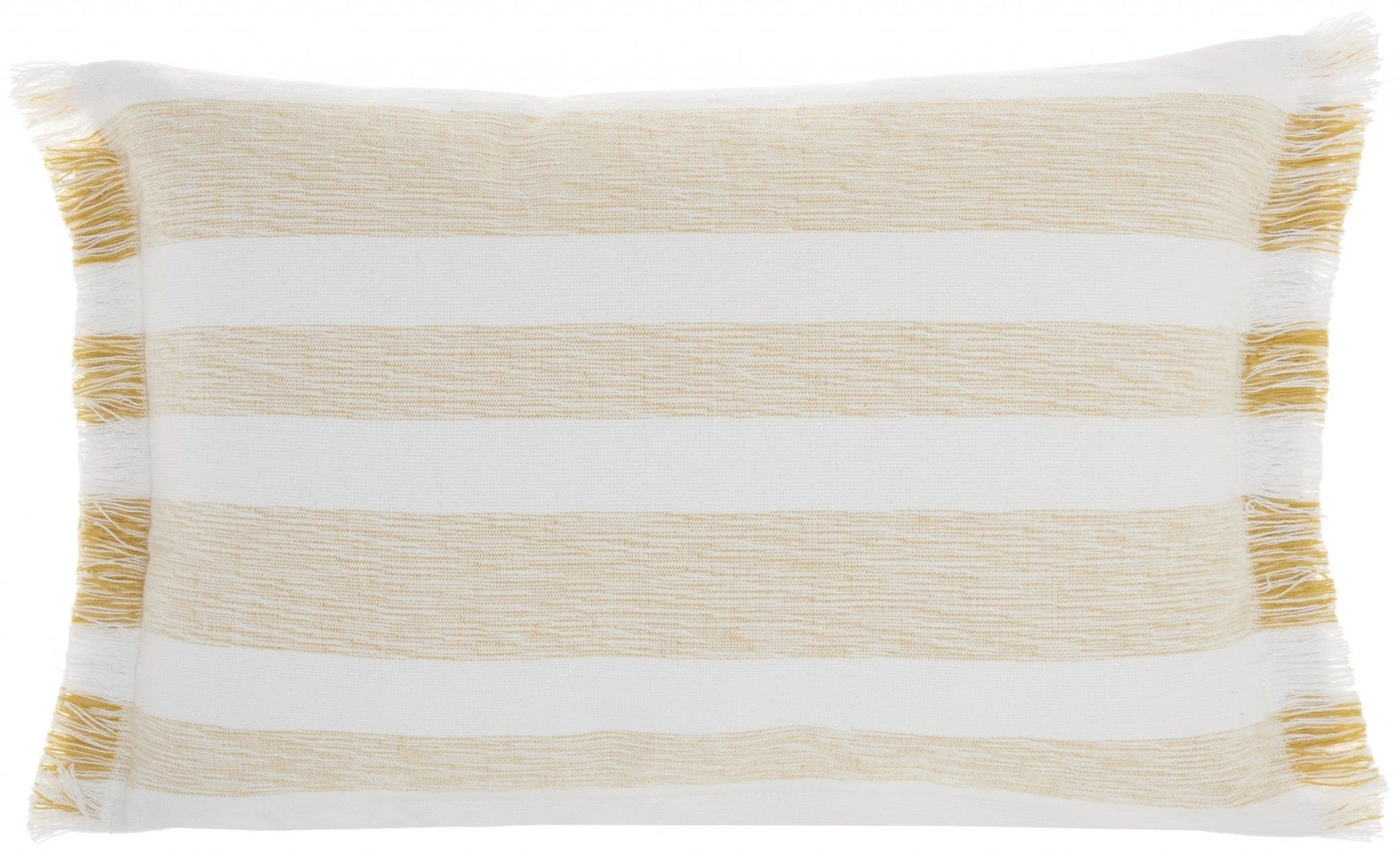Induce a sense of warmth and coziness into your place with this Golden Yellow and White Soft Stripes Throw Pillow that flaunts a relaxed and laid-back feel in its simplicity. Showcasing clean-lined alternating stripes in pastel hues of yellow ochre and creamy white in the middle with ornamental fringes on the edges gives off a farmhouse appeal. Made to stand the test of time, this 100% cotton-made pillow is super durable, easy to clean, and more breathable. Pair this soft and sumptuous throw pillow with neutral shades or vibrant hues for a blissful harmony or a striking contrast. 14” x 20”x 5"