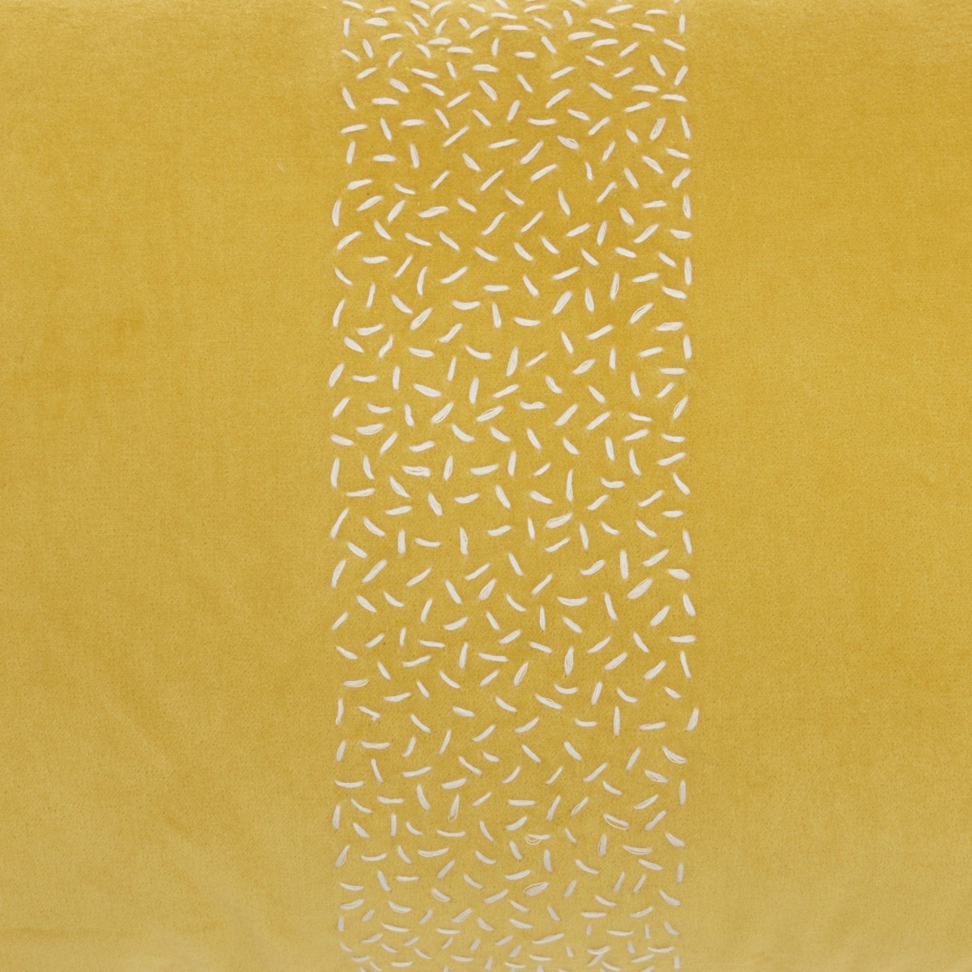 This Yellow Lumbar Pillow with Center Pattern is the perfect mix of comfort and design and will invoke a sense of whimsy in any space of your home. This rectangular shaped lumbar pillow is covered with a soft and luxurious yellow fabric. The minimal background is elevated by the center stripe with has a small dash design in a white color. This lumbar pillow will help make any couch or chair more comfortable for you to sit on and add a touch of minimal design as well. 5" H x 12" W x 20" D
